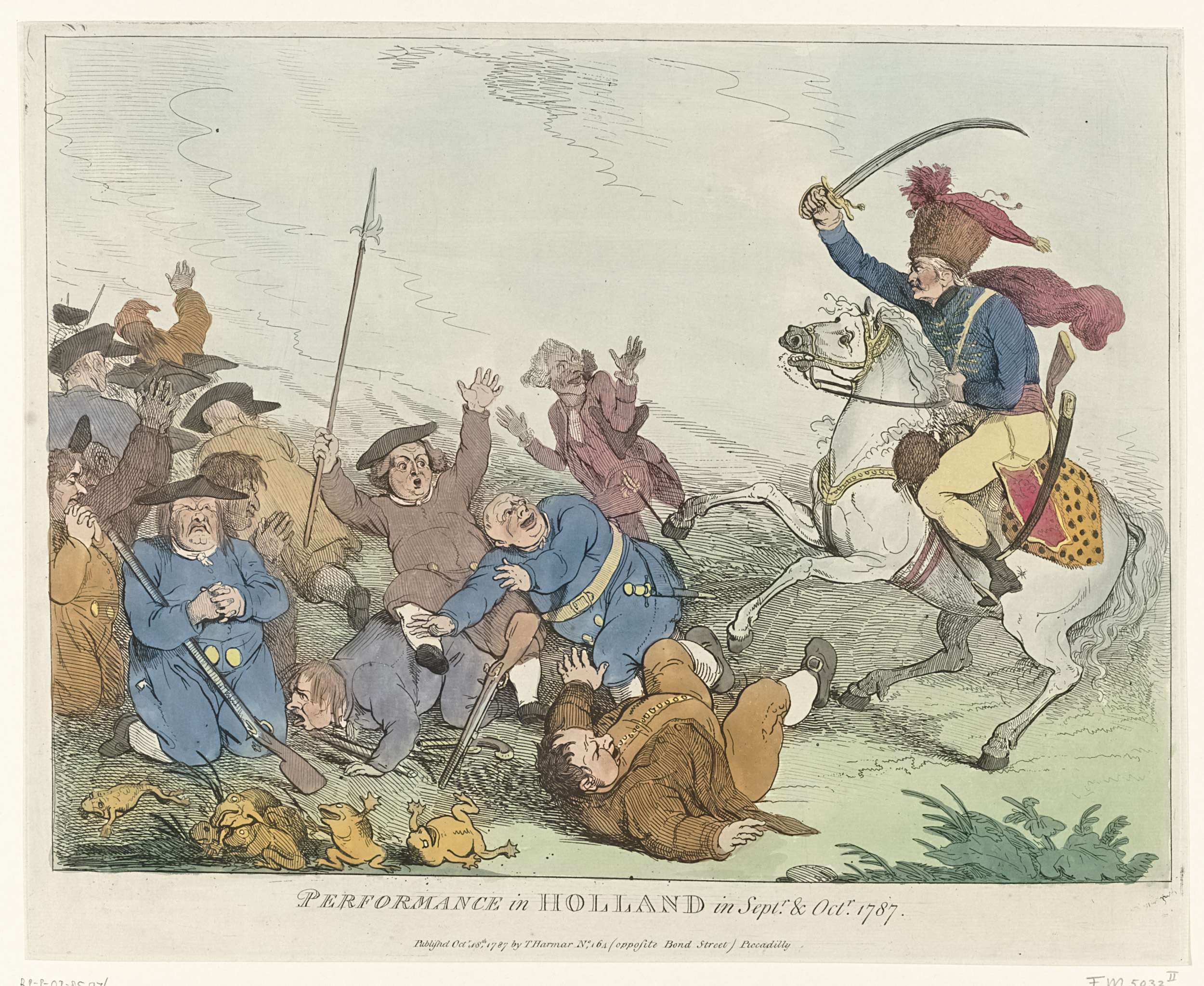 Als de Pruisische huzaren daadwerkelijk in Nederland komen opdagen is het snel afgelopen met de pret. In september 1787 vielen zij de Republiek binnen om de macht van de stadhouder en de eer van de prinses te herstellen. Vluchtend buitelen de hiervoor zo dappere Hollanders nu over elkaar heen. In beide prenten imiteren kikkers, een ...