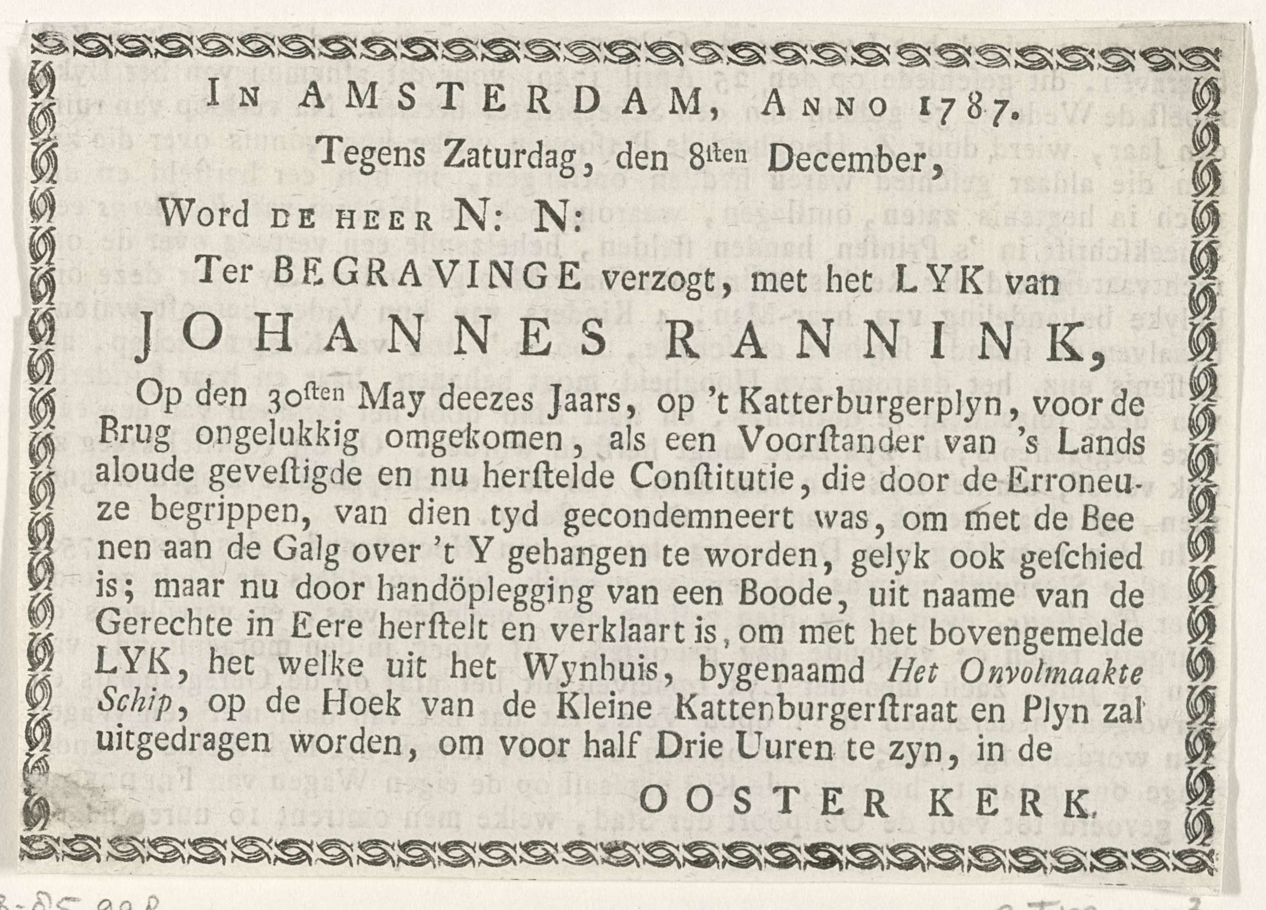 Begrafenisbriefje met de uitnodiging tot het bijwonen van de begrafenis op 8 december 1787 van Johannes Rannink, aanvoerder van de bijltjes, de opstandige Oranjegezinde Amsterdamse scheepstimmerlieden die op het eiland Kattenburg in opstand kwamen tegen het patriotse stadsbestuur, en die sneuvelde op 30 mei 1787. Uit een courant geknipt, bedrukt met tekst op achterzijde.