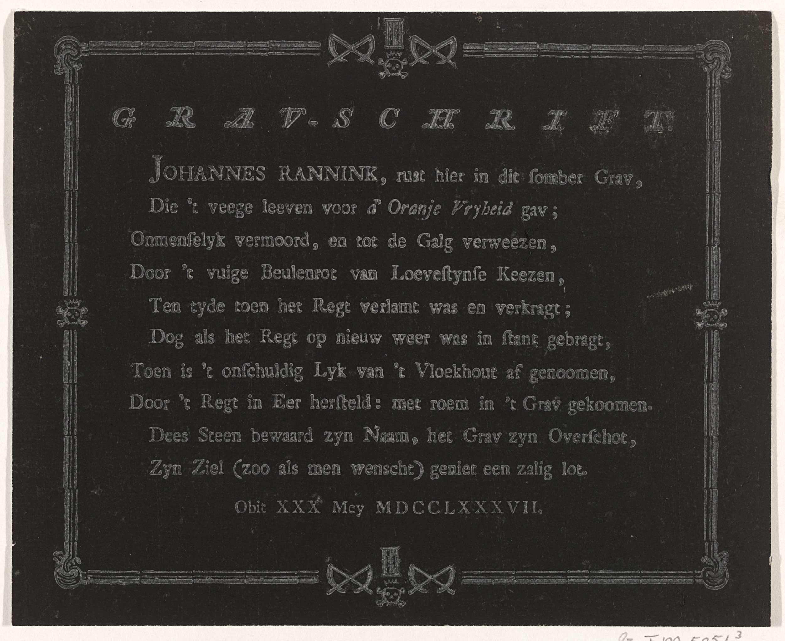 Zwart blad met een grafschrift voor Johannes Rannink, aanvoerder van de bijltjes, de opstandige Oranjegezinde Amsterdamse scheepstimmerlieden die op het eiland Kattenburg in opstand kwamen tegen het patriotse stadsbestuur. Gesneuveld op 30 mei 1787 en begraven op 8 december 1787. Tekst gedrukt in wit in een omlijsting versierd met doodskoppen, zandlopers en gekruiste zeisen.
