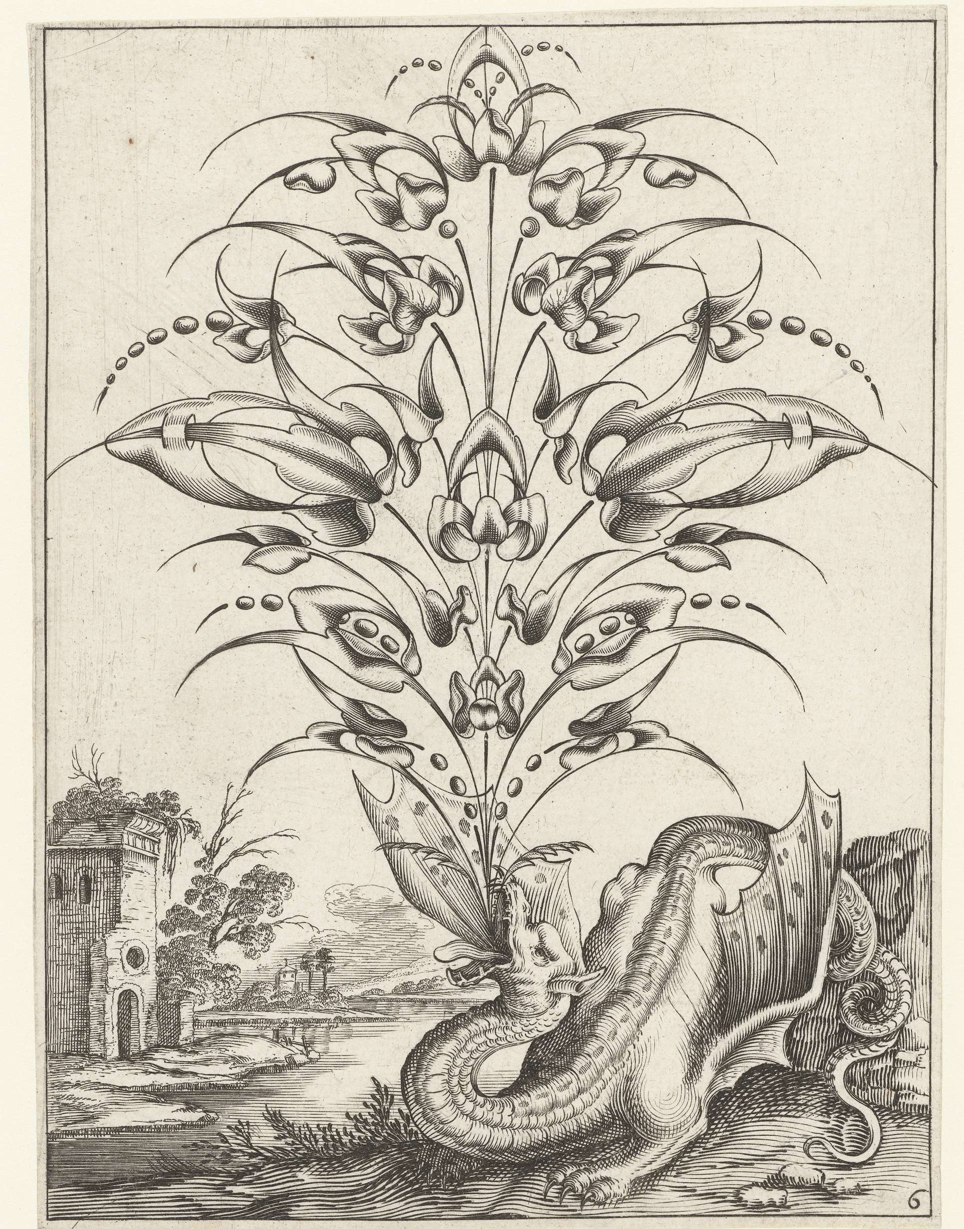 Linksonder een rivierlandschap en de ruïne van een huis. Uit serie van 6 bladen met goudsmidsboeketten in peulvruchtenstijl.