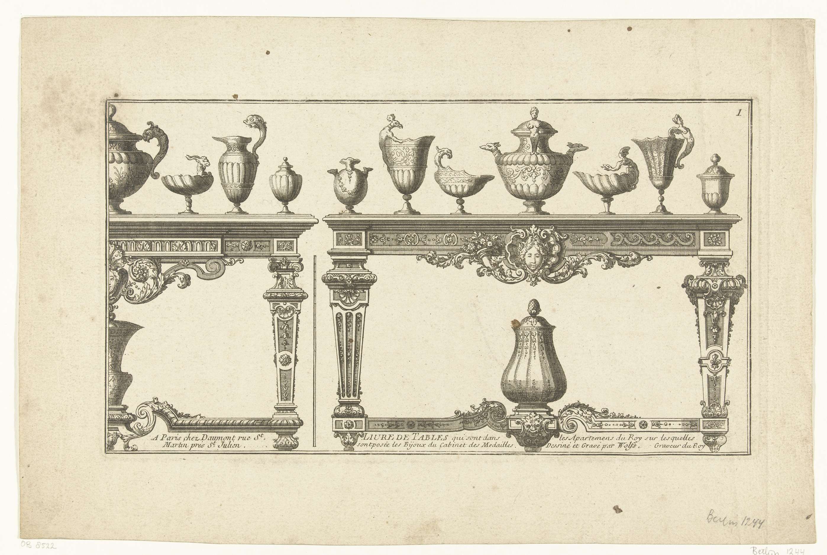 Twee tafels met gebruiksvoorwerpen. Uit serie tafels en gebruiksvoorwerpen in de collectie van Louis XIV. Tweede editie.