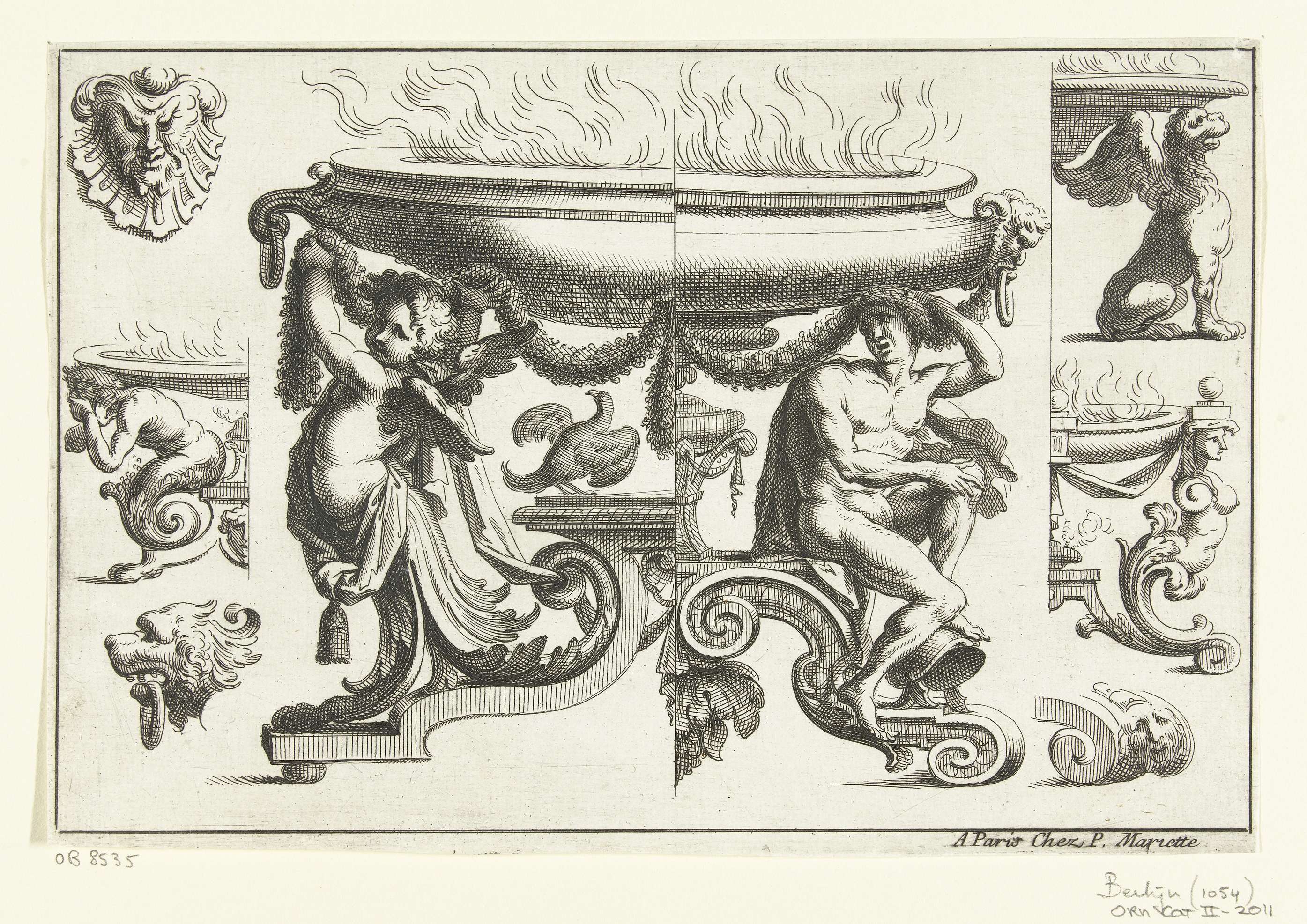De stoof links wordt gedragen door een putto, de stoof rechts door een jongeman. Links en rechts staan drie helften van kleinere stoven en ornamenten. Blad 2 uit serie van 6 bladen, eerste editie.