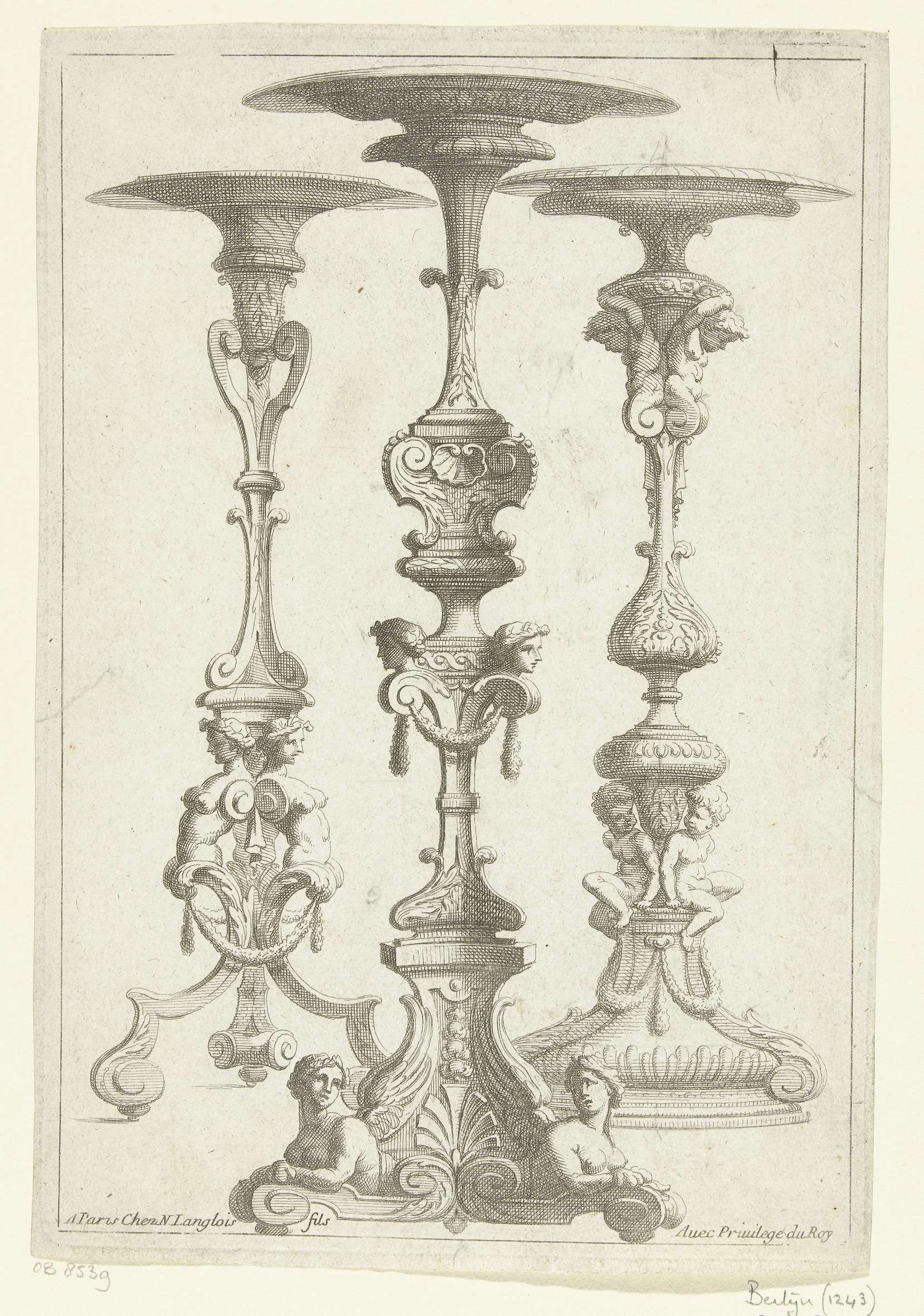 De middelste kaarsendrager heeft een voet met twee sfinxen. Uit serie van 6 bladen, eerste editie.