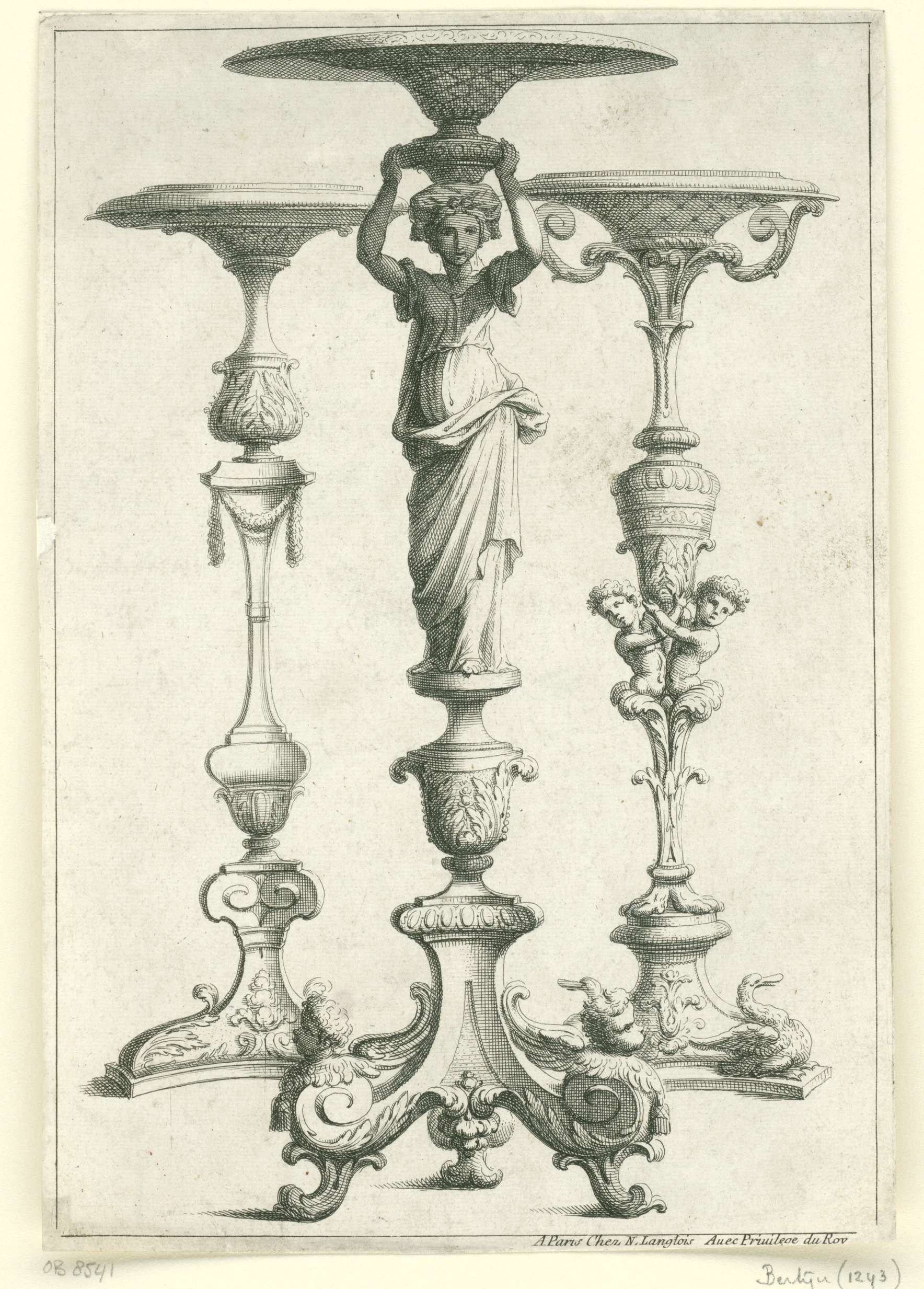 De middelste kaarsendrager heeft een stam in de vorm van een staande vrouw. Uit serie van 6 bladen, eerste editie.