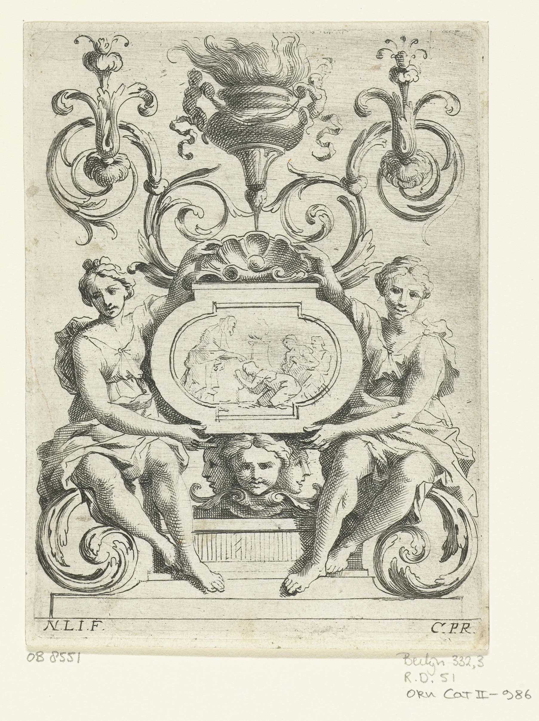 De vrouwen zitten op een bladrank en houden een ovaal paneel met een offerscène vast. Blad 6 uit serie van 12.
