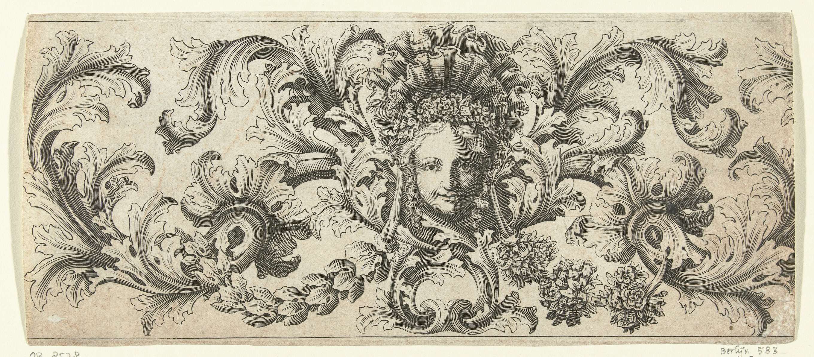 Links van het masker bevindt zich een guirlande van bladeren, rechts een gurilande van bloemen en bladeren. Blad 5 uit serie van 12 bladen.