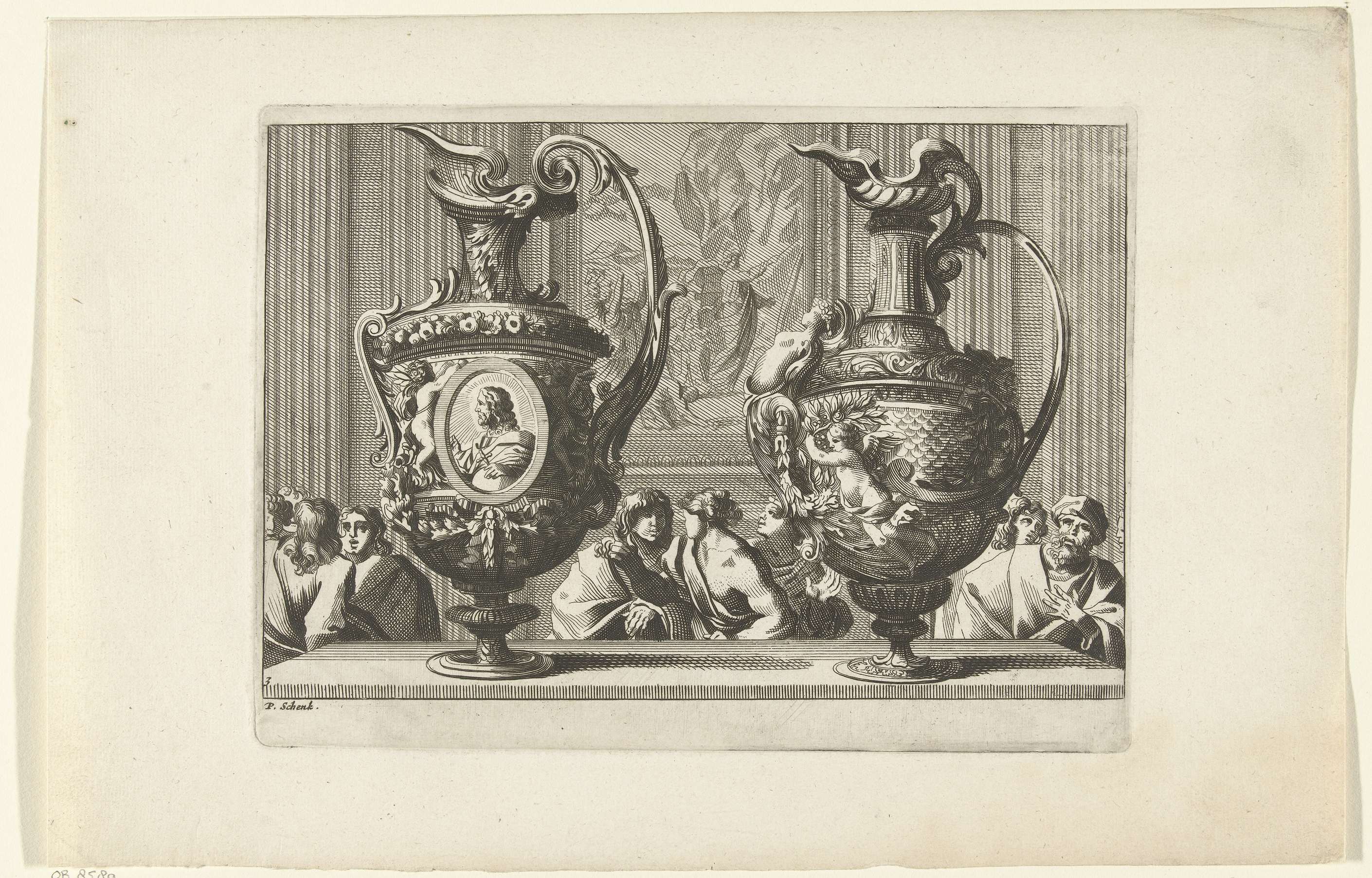 Op het lichaam van de schenkkan links staat een ovaal medaillon met een buste van Christus.