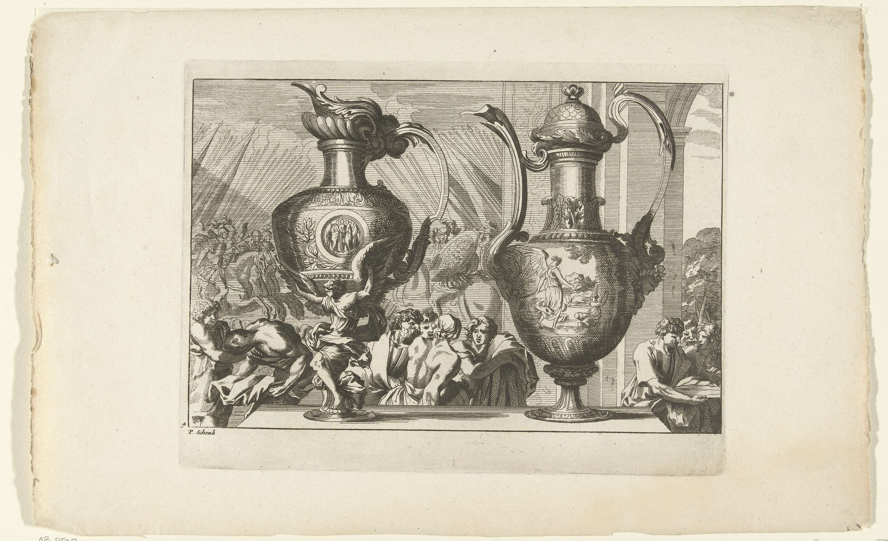 De schenkkan links heeft een voet in de vorm van een engel, op het lichaam van de vaas rechts staan Tobias en de engel.