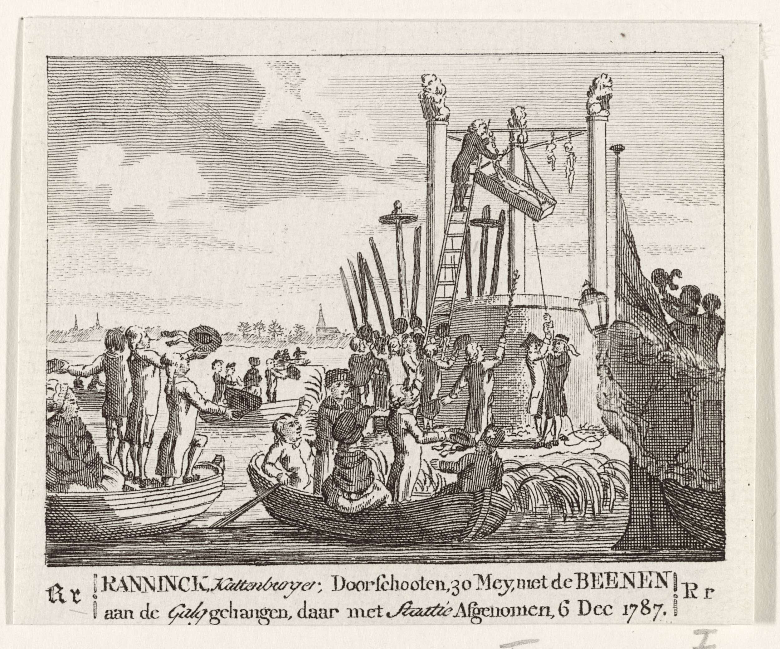 Het lijk van Johannes Rannink, aanvoerder van de bijltjes, de opstandige Oranjegezinde Amsterdamse scheepstimmerlieden die op het eiland Kattenburg in opstand kwamen tegen het patriotse stadsbestuur, en die sneuvelde op 30 mei 1787, wordt op 6 december met statie van de galg gehaald. Plaatje behorend bij de letter R uit een ABC boek.