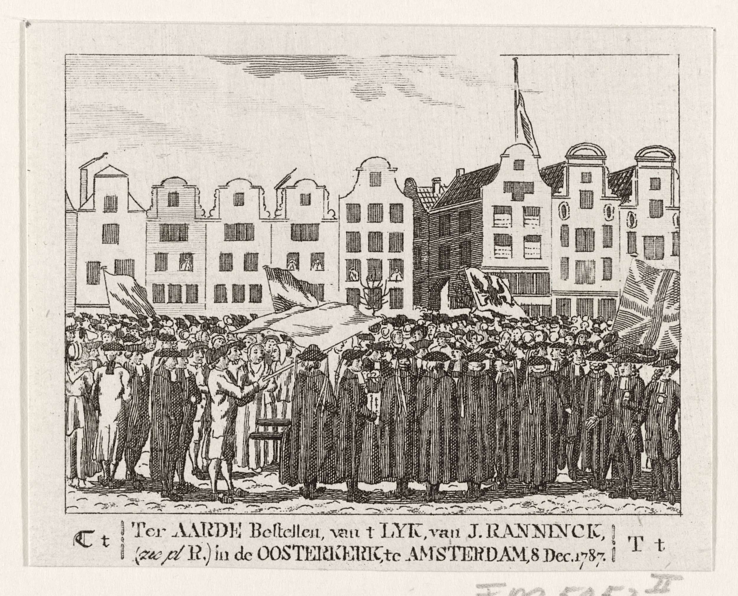 Begrafenis van het lijk van Johannes Rannink, aanvoerder van de bijltjes, de opstandige Oranjegezinde Amsterdamse scheepstimmerlieden die op het eiland Kattenburg in opstand kwamen tegen het patriotse stadsbestuur, en die sneuvelde op 30 mei 1787, op 6 december van de galg gehaald en op 8 december begraven in de Oosterkerk. Plaatje behorend bij de letter ...