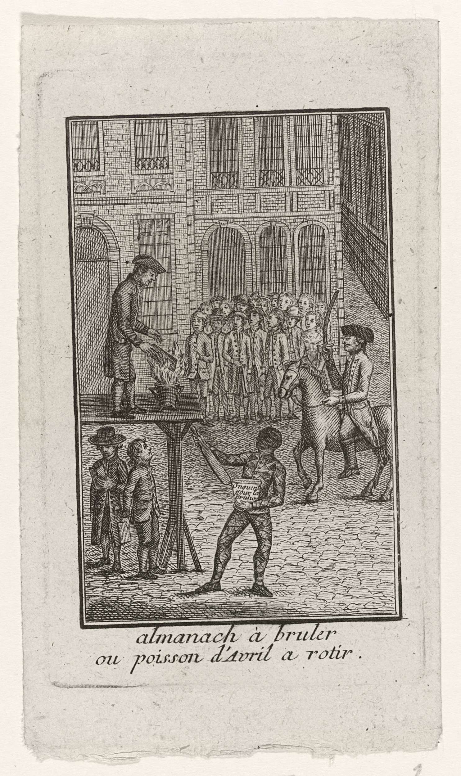 Op een markt wordt een boek of geschrift in het openbaar op een schavot verbrand. Een harlekijn reikt de beul een spaan en een brandmiddel. Onderdeel van een grote groep van prenten betrekking hebbend op de gebeurtenissen van de Brabantse Omwenteling en de periode 1787-1790.