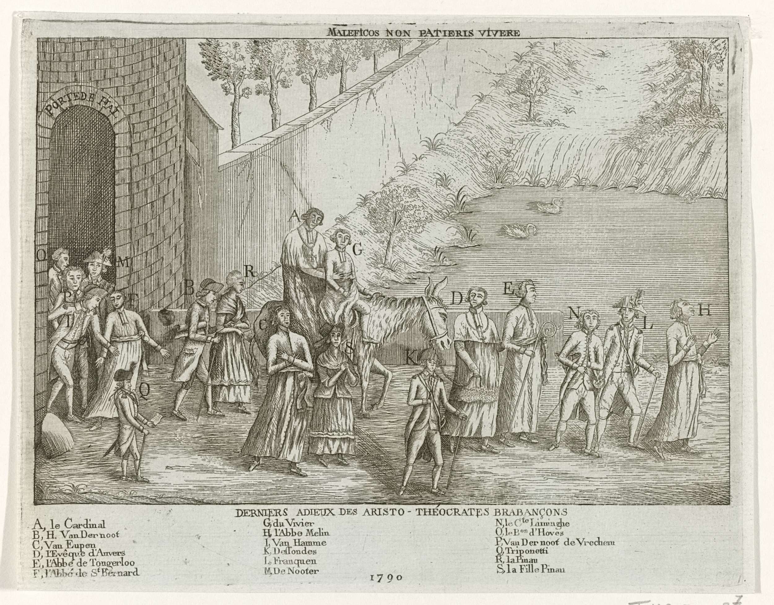 De Brabantse theocraten worden door de Hallepoort uit Brussel verdreven. Met legenda A-S met de namen van de voorgestelden. Onderdeel van een grote groep van prenten betrekking hebbend op de gebeurtenissen van de Brabantse Omwenteling en de periode 1787-1790.
