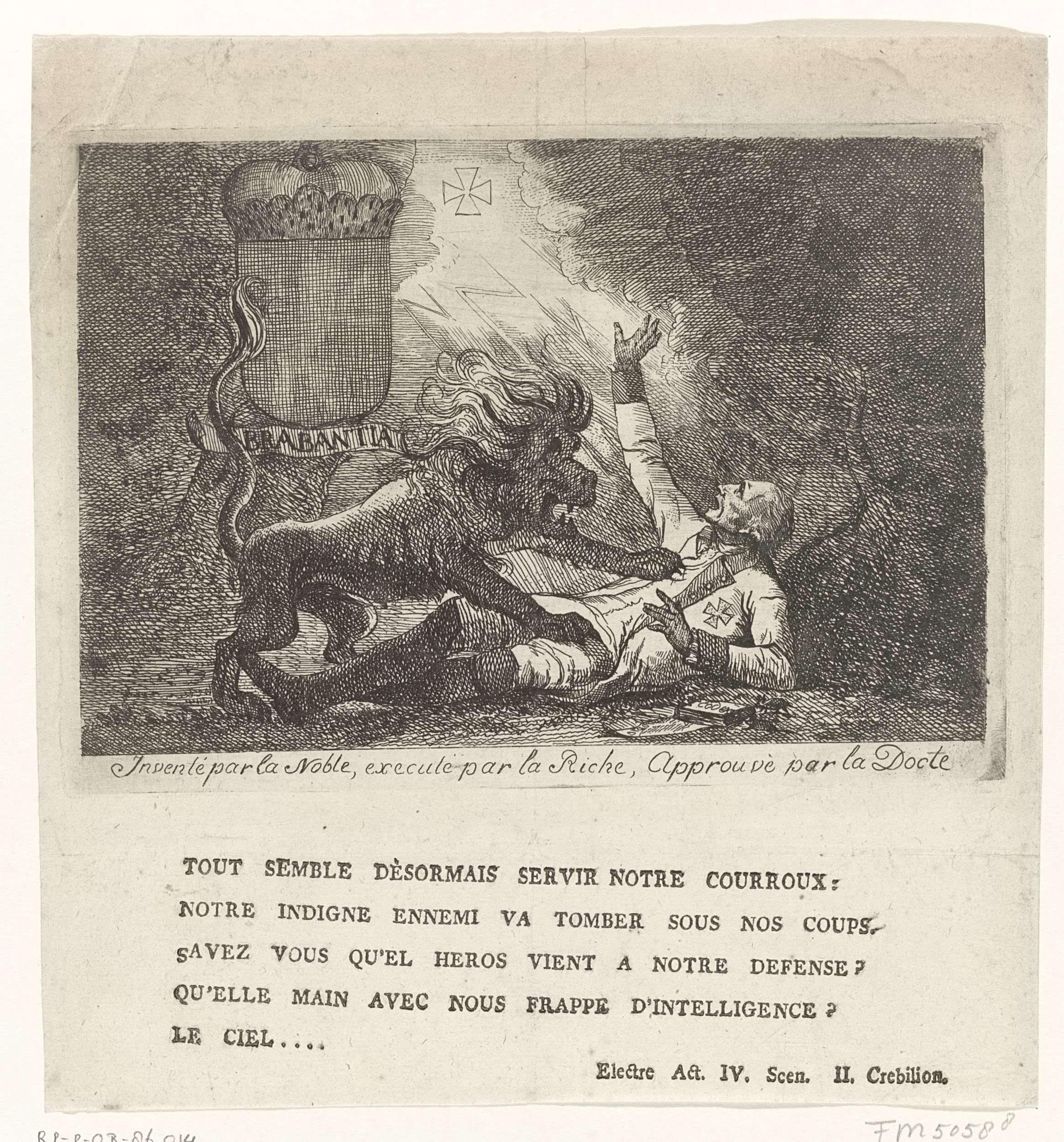 De op de grond liggende Oostenrijkse keizer Jozef II wordt aangevallen door een woeste Brabantse leeuw. Met onderschrift van één regel. Op het blad onder de plaat een citaat van vijf regels uit het toneelstuk Electra in het Frans. Onderdeel van een grote groep van prenten betrekking hebbend op de gebeurtenissen van de Brabantse Omwenteling ...