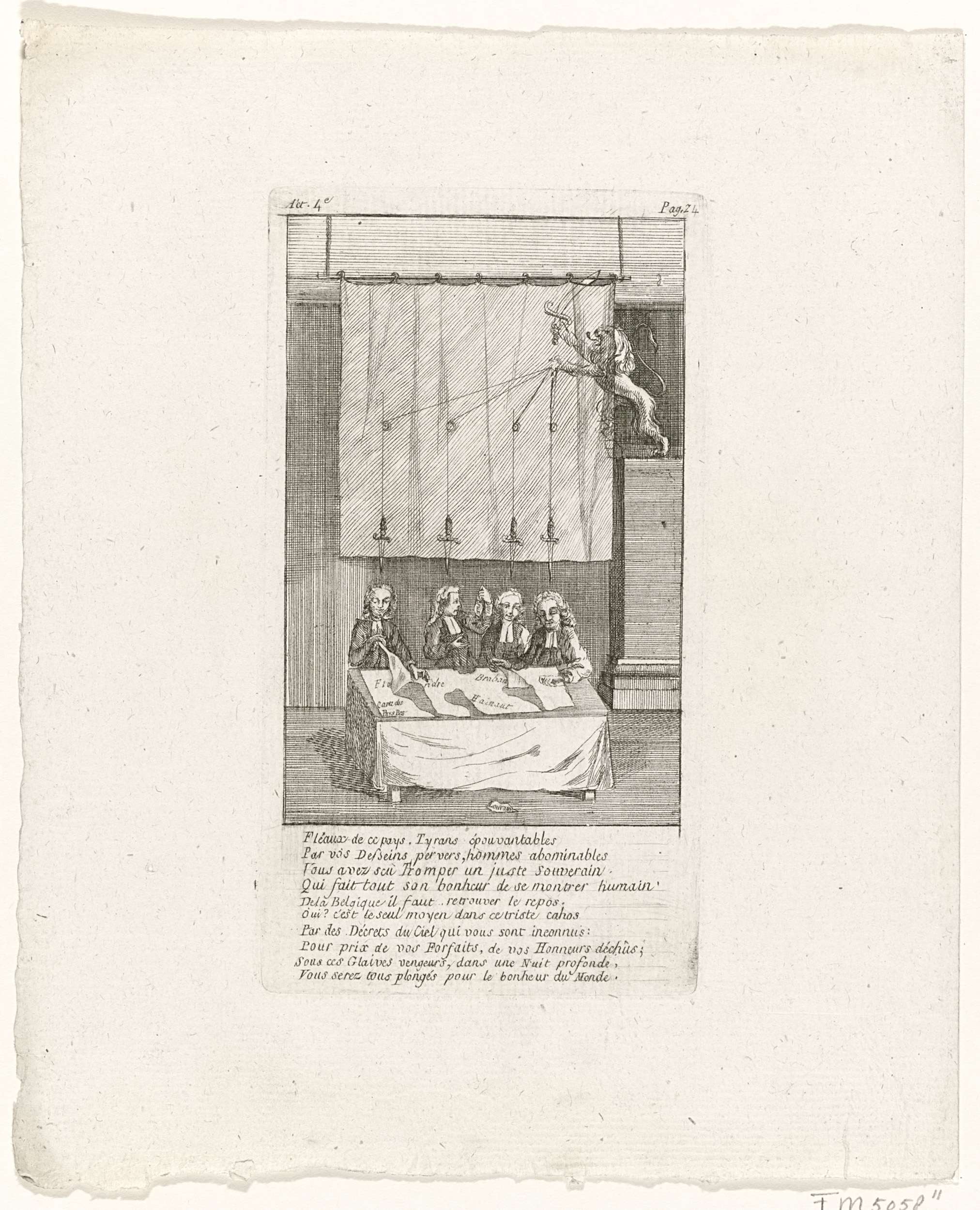 Rechters gezeten aan een tafel verscheuren de kaart van de Oostenrijkse Nederlanden. Boven hun hoofden hangen zwaarden aan touwen, als zwaard van Damocles, vastgehouden door de Brabantse leeuw. Met tienregelig vers in het Frans. Gemerkt bovenaan: Act. 4e / Pag. 24. Onderdeel van een grote groep van prenten betrekking hebbend op de gebeurtenissen van de ...