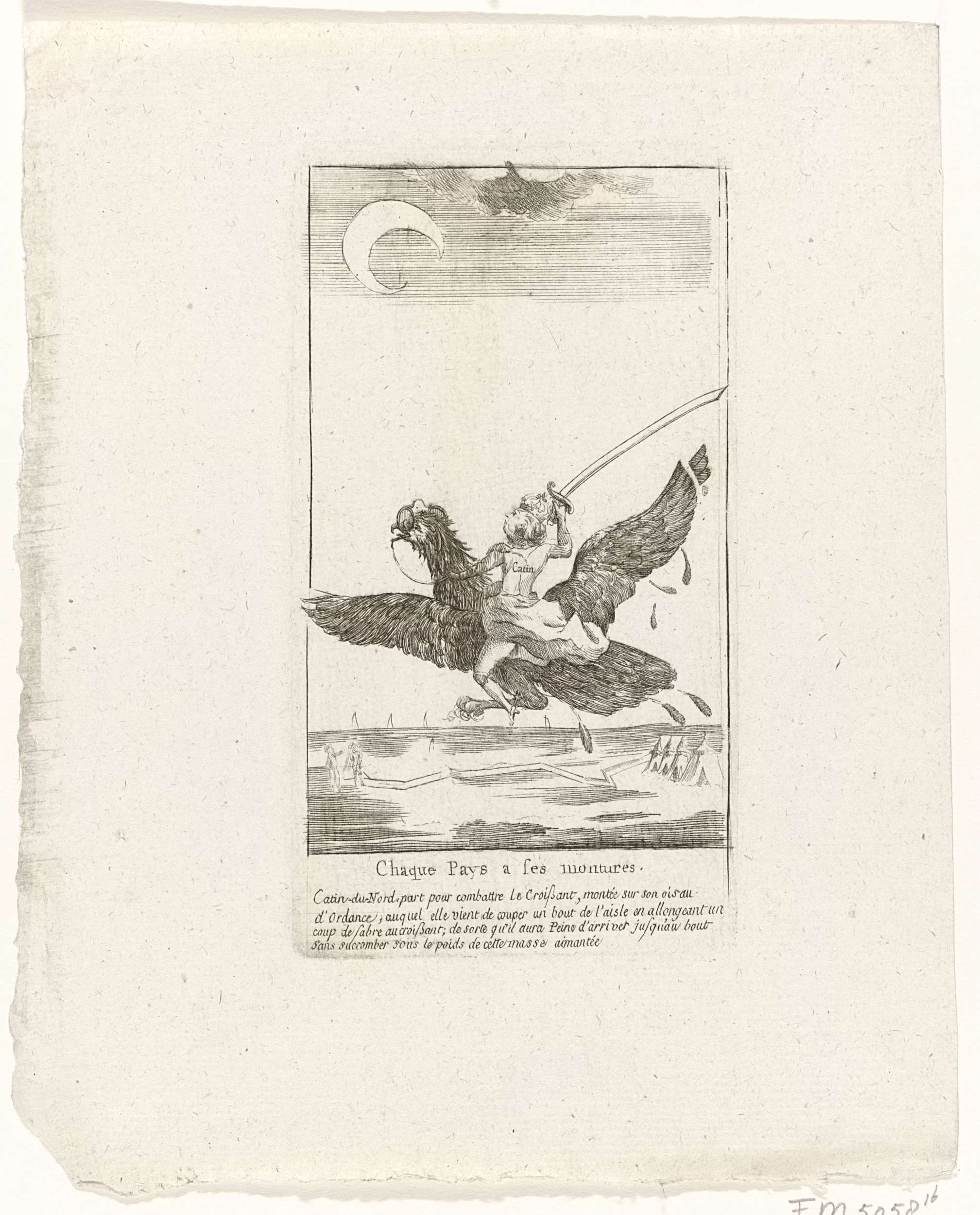 Spotprent op keizerin Catharina II de Grote die gezeten op de Oostenrijkse adelaar met bril met getrokken sabel vliegt naar de halve maan (= ten strijde trekt tegen de Turken). Zij snijdt hierbij met haar sabel een deel van de vleugel van de adelaar af. Met vierregelig Frans onderschrift waarin de Russische tsarina de Catin-du-Nord ...