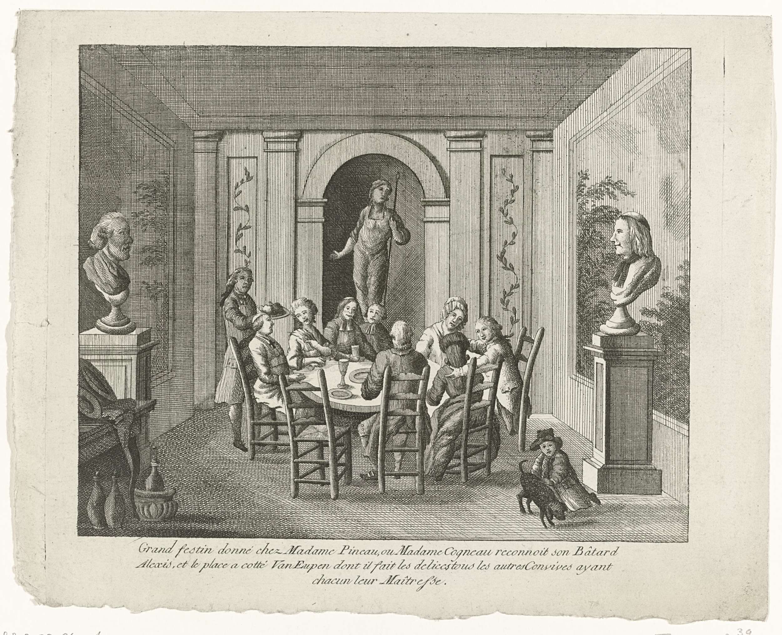 Interieur van een salon bij Madame Pineau (of Pinau) waar een feestmaal gehouden wordt. Aan tafel zitten genodigden, waaronder Van Eupen, met hun maîtresses. Onderdeel van een grote groep van prenten betrekking hebbend op de gebeurtenissen van de Brabantse Omwenteling en de periode 1787-1790.