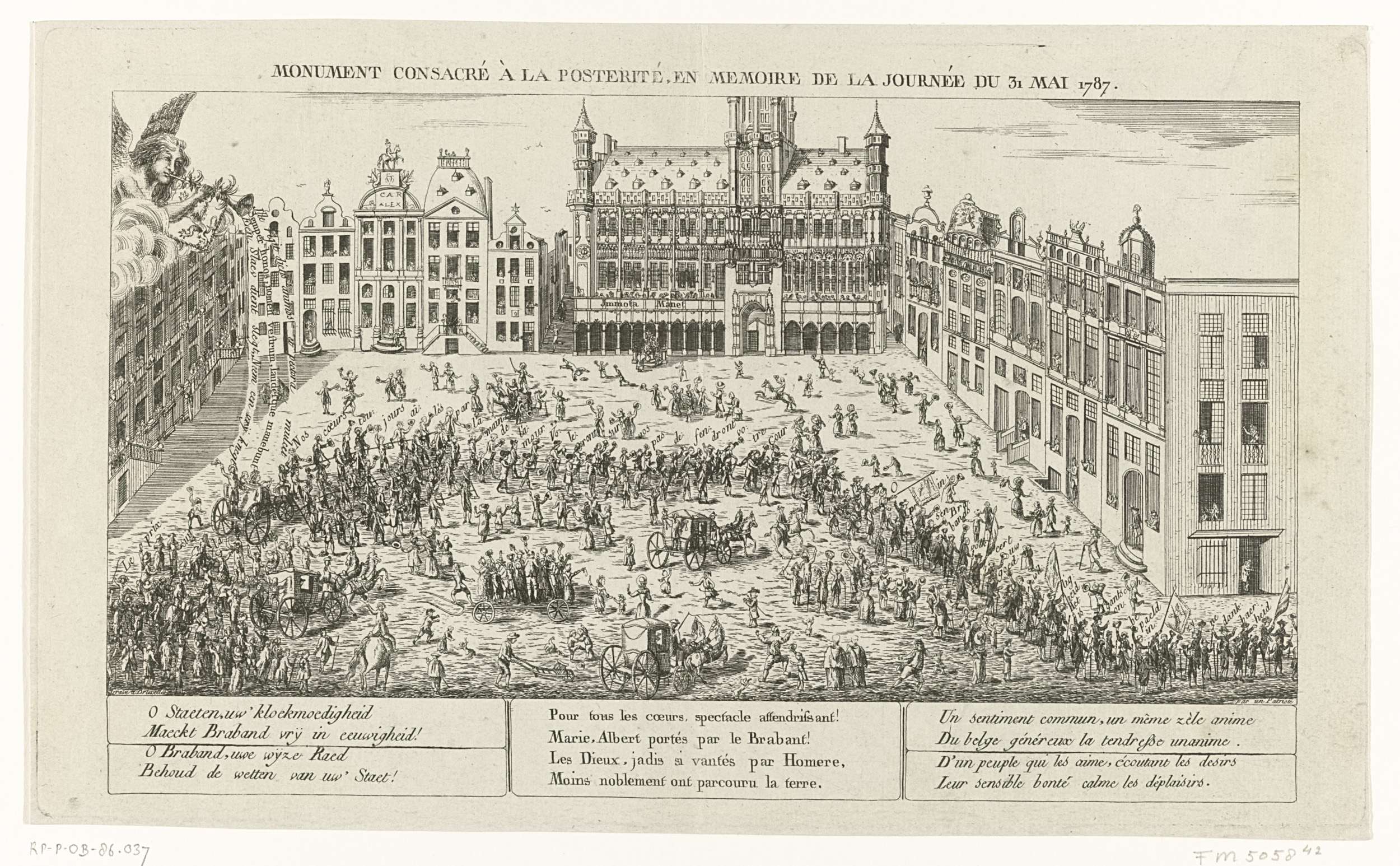 Gezicht op de Grote Markt van Brussel waar het volk bijeen is gekomen om de Staten van Brabant toe te juichen op 31 mei 1787. Met onderschriften in het Nederlands en Frans. Onderdeel van een grote groep van prenten betrekking hebbend op de gebeurtenissen van de Brabantse Omwenteling en de periode 1787-1790.