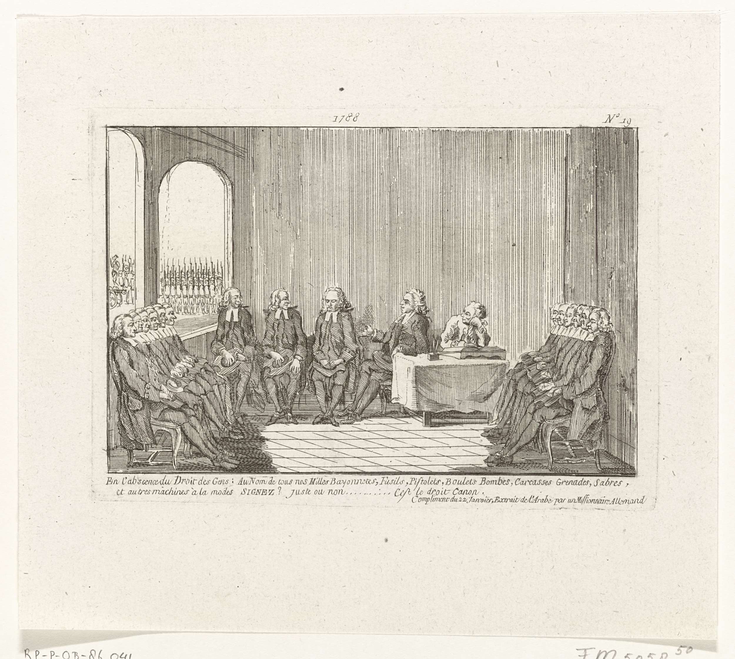 De Raad van Brabant onder dreiging van geweld van Trauttmansdorff bijeen in een vergaderzaal, 22 januari 1788 te Brussel. Genummerd rechtsboven: No. 19. Onderdeel van een grote groep van prenten betrekking hebbend op de gebeurtenissen van de Brabantse Omwenteling en de periode 1787-1790.