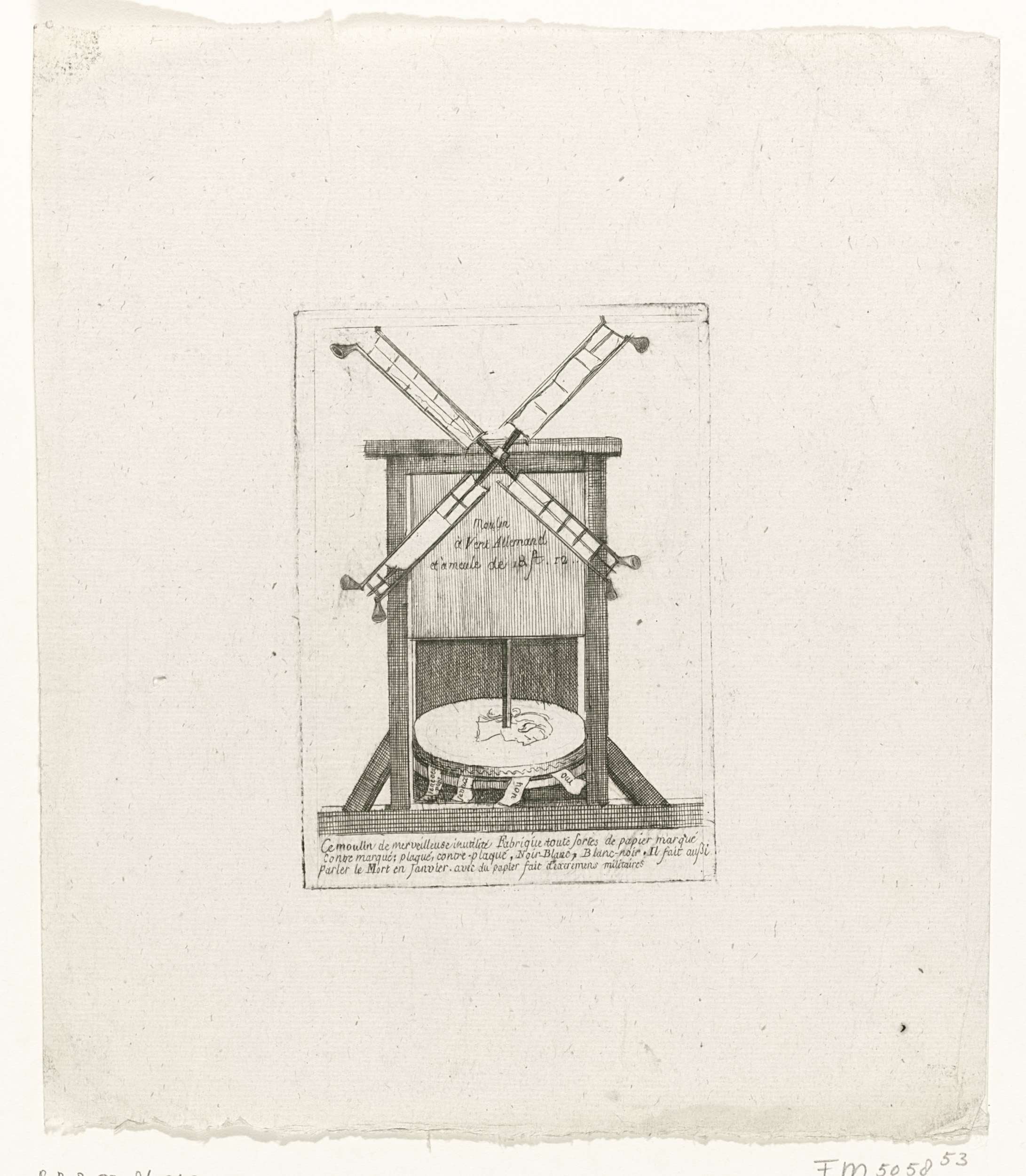 Spotprent met een Duitse windmolen waarin allerlei soorten papier gemaakt worden. Op de molensteen de kop van Jozef II. Met Frans onderschrift van drie regels. Onderdeel van een grote groep van prenten betrekking hebbend op de gebeurtenissen van de Brabantse Omwenteling en de periode 1787-1790.