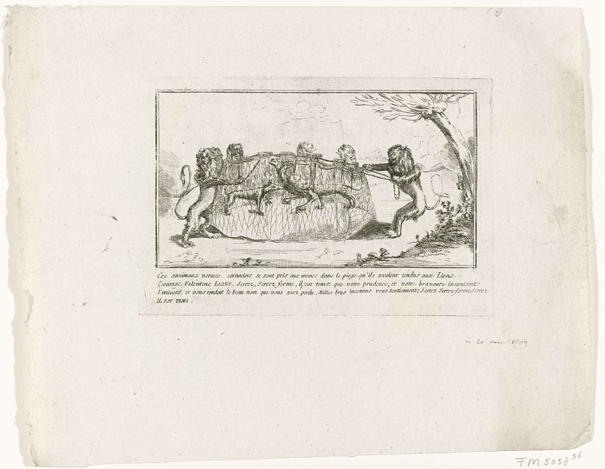 Spotprent waarin de Oostenrijkse adelaar, een wolf met het Gulden Vlies (keizer Jozef II) en een luipaard (generaal d'Alton) in een net zijn gevangen door Brabantse leeuwen. Hierbij de datum 20 augustus 1789 met de hand geschreven. Met vierreglig onderschrift in het Frans. Onderdeel van een grote groep van prenten betrekking hebbend op de gebeurtenissen ...