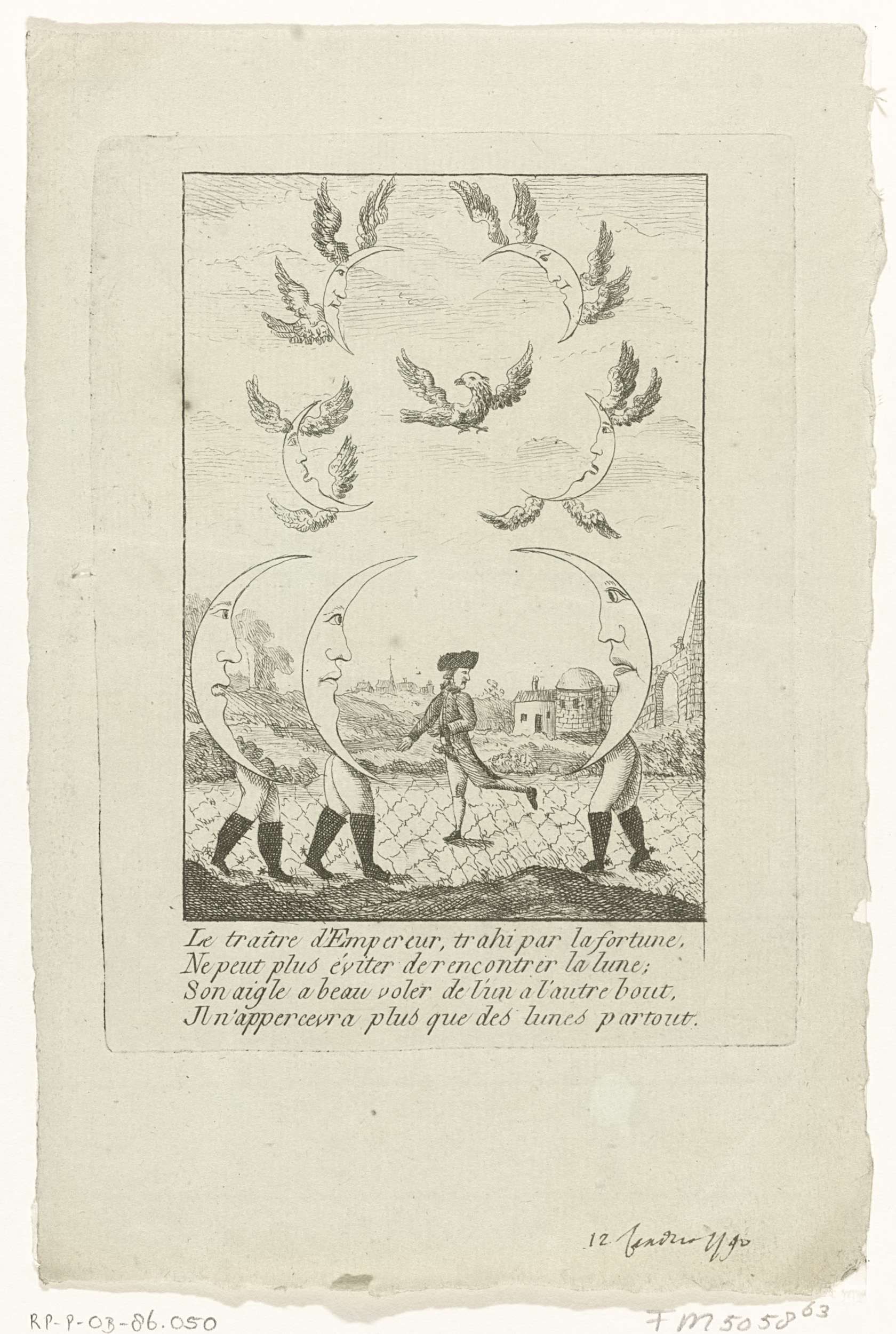 Spotprent op keizer Jozef II. Een man omsingeld door drie maansikkels op menslijke benen. In de lucht wordt de Oostenrijkse adelaar omsingeld door vier maansikkels met vleugels. Hierbij de datum 12 januari 1790 met de hand geschreven. Onderdeel van een grote groep van prenten betrekking hebbend op de gebeurtenissen van de Brabantse Omwenteling en de ...
