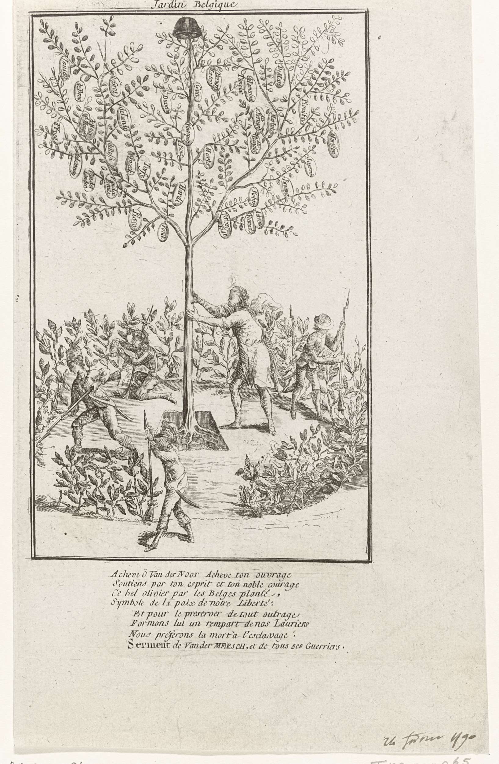 Allegorische voorstelling waarin een olijfboom en tevens vrijheidsboom wordt geplant. Aan de boom hangen de namen van Brabantse patriotten. Vier militairen planten een omheining van laurierstruiken om de boom. Met onderschrift van acht regels in het Frans waarin Van der Noot en Van der Mersch worden geroemd. Hierbij de datum 24 februari 1790 met de ...