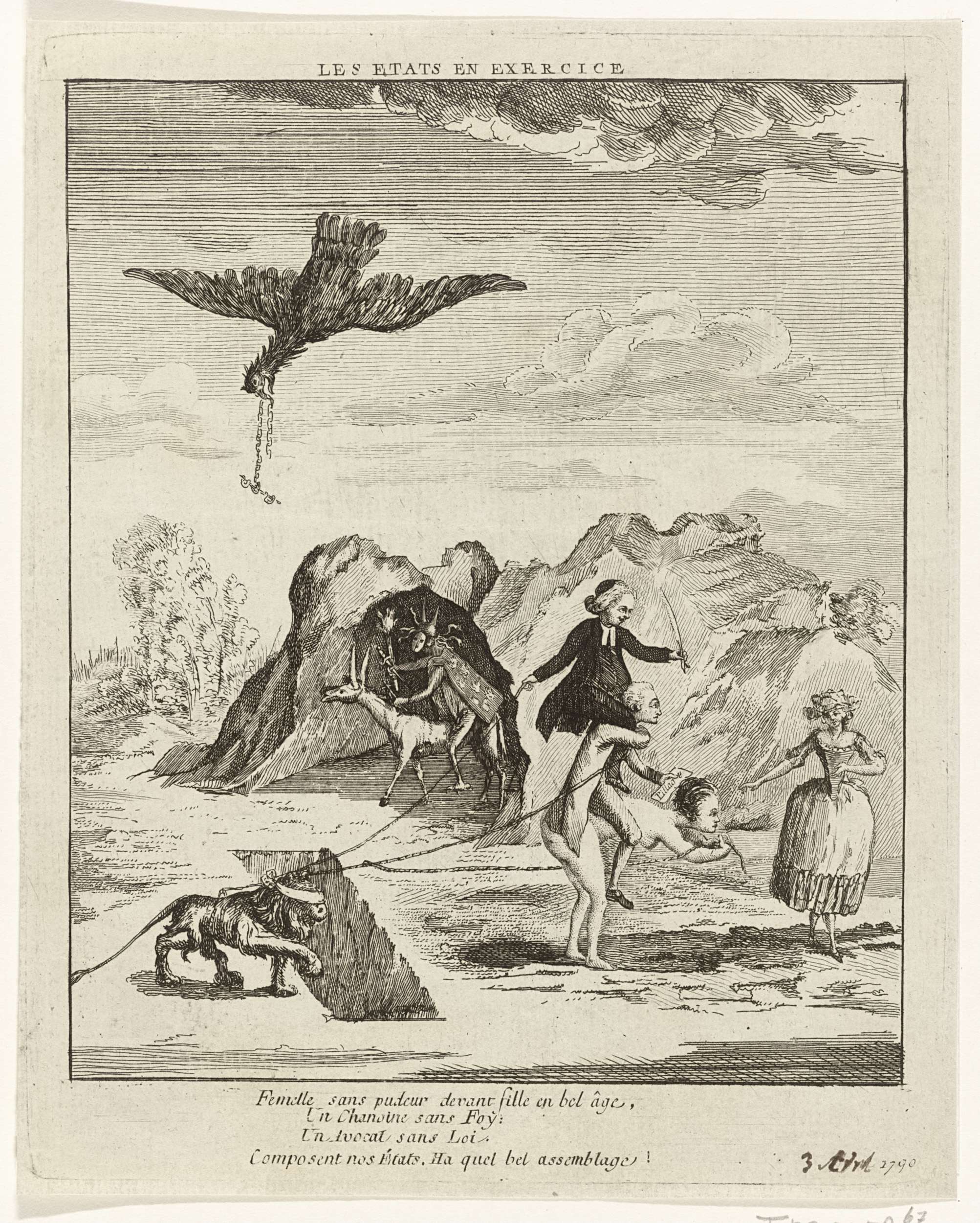 Spotprent waarin Hendrik van der Noot en Petrus van Eupen zitten op de rug van een naakte vrouw. Zij zijn met kettingen verbonden aan de geblinddoekte Brabantse leeuw en worden door een jonge vrouw (Madame Pinau?) gelokt waardoor de blinde leeuw in een kuil dreigt te stappen. In de lucht de Oostenrijkse adelaar met boeien ...