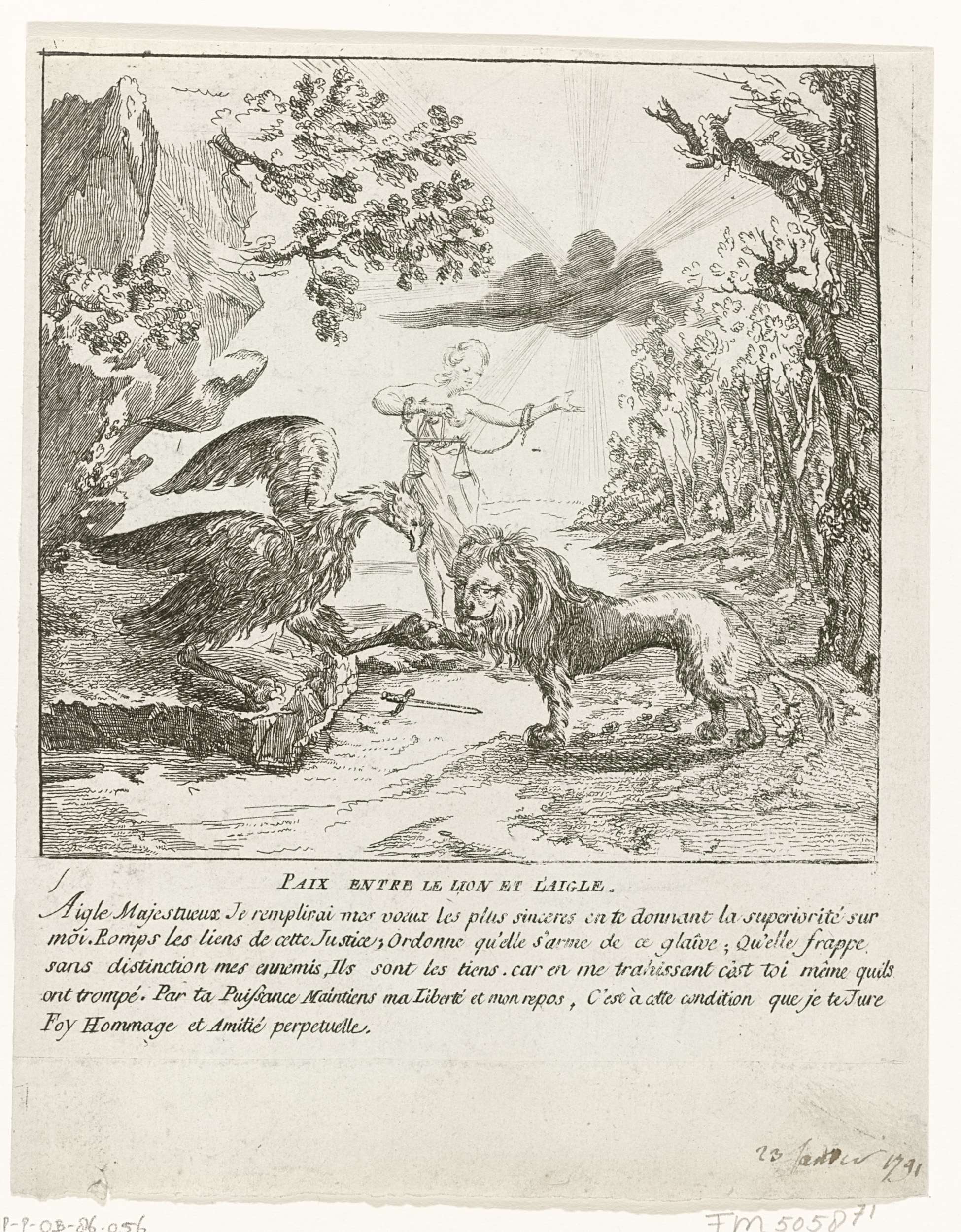 Allegorische voorstelling van de vrede bereikt tussen Oostenrijk en de Zuidelijke Nederlanden. De personificatie van de Rechtvaardigheid staande tussen de Oostenrijkse adelaar en de Brabantse leeuw. Met vijfregelig Frans onderschrift. Hierbij de datum 23 januari 1791 met de hand geschreven. Onderdeel van een grote groep van prenten betrekking hebbend op de gebeurtenissen van de Brabantse ...