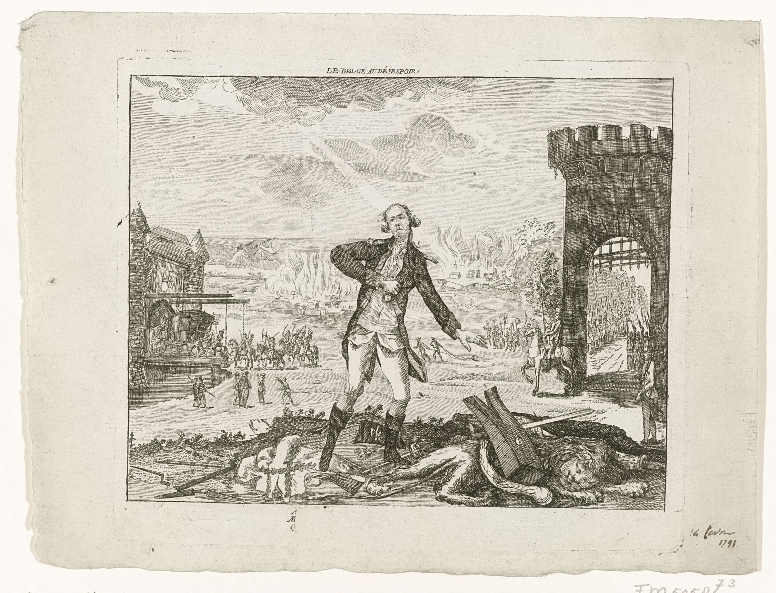 Voor een landschap geteisterd door oorlog staat een wanhopige man die de Brabantse omwenteling personifieert. Voor hem ligt op de grond de gedode Brabantse leeuw, wapentuig en steek met kokarde. Met sporen van een onderschrift van drie regels. Hierbij de datum 14 februari 1791 met de hand geschreven. Onderdeel van een grote groep van prenten ...