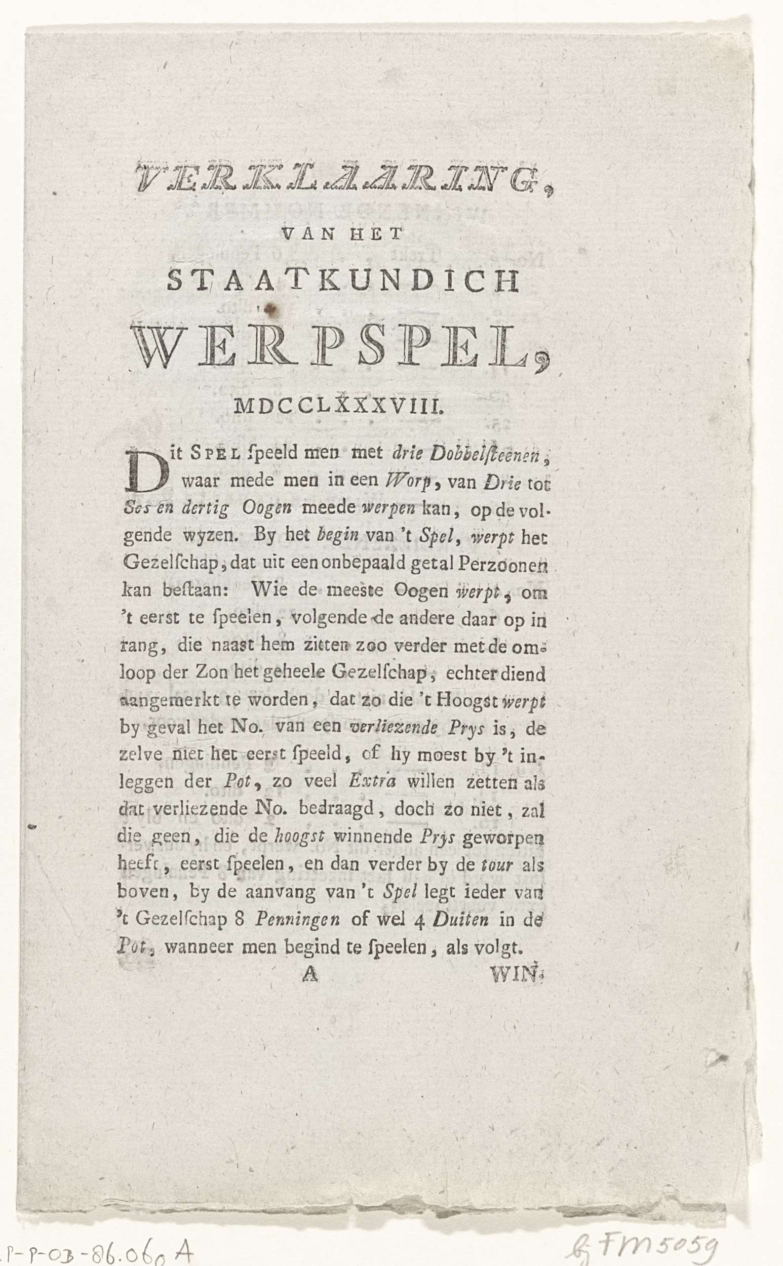 Tekstblad met een verklaring van de spelregels voor het bordspel met spotprenten op de patriotten, 1788. In vieren gevouwen blad bedrukt op alle zijden.