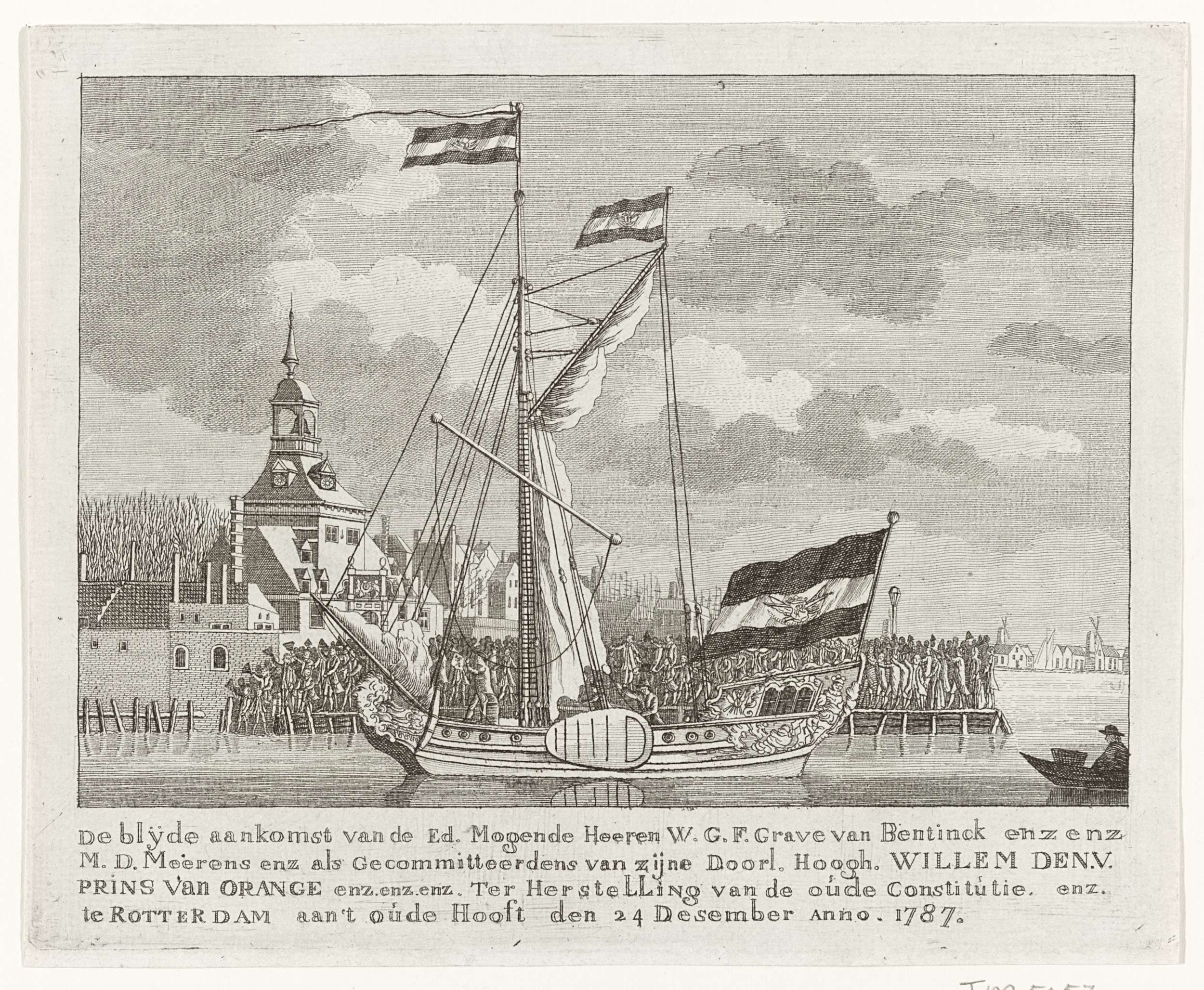 Aankomst van het prinselijk jacht met de graaf Bentinck en Meerens als vertegenwoordigers van prins Willem V te Rotterdam op 24 december 1787 om de oude grondwet weer te herstellen. Links de Oude Hoofdpoort.
