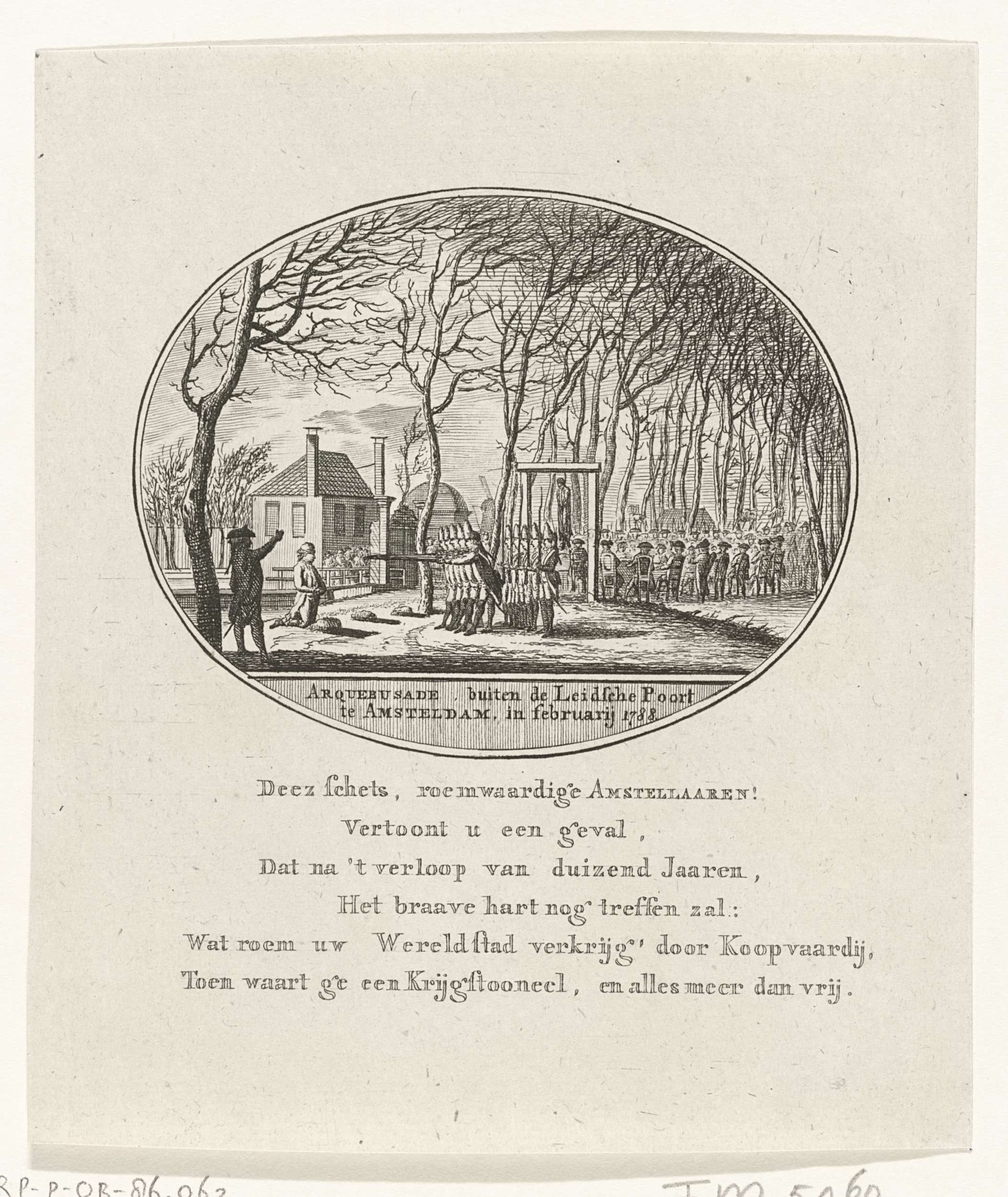 Terechtstellingen door het regiment Zwitsers van May, buiten de Leidsepoort te Amsterdam, februari 1788. Krijgsraad in de open lucht, een veroordeelde hangt aan de galg, een ander knielt links voor een vuurpeloton. Met zesreglig vers onder de ovale voorstelling.