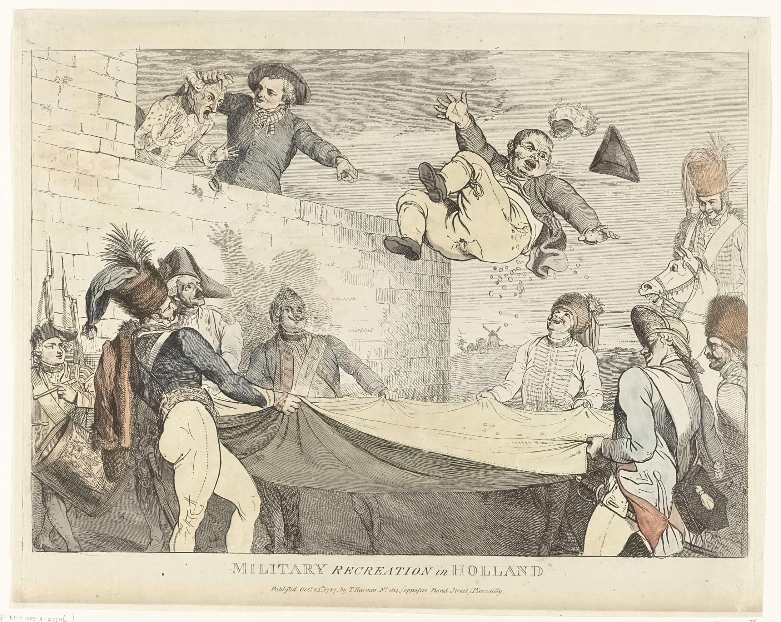 Een Hollandse patriot wordt door Pruisische soldaten in een deken in de lucht gegooid, waardoor de geldstukken uit zijn zakken vliegen. Linksboven dwingt een Engelse matroos de Fransman toe te kijken. Pastiche op een illustratie van een episode uit de avonturen van Don Quichot en Sancho Panza. Onderdeel van een groep van vier spotprenten op ...