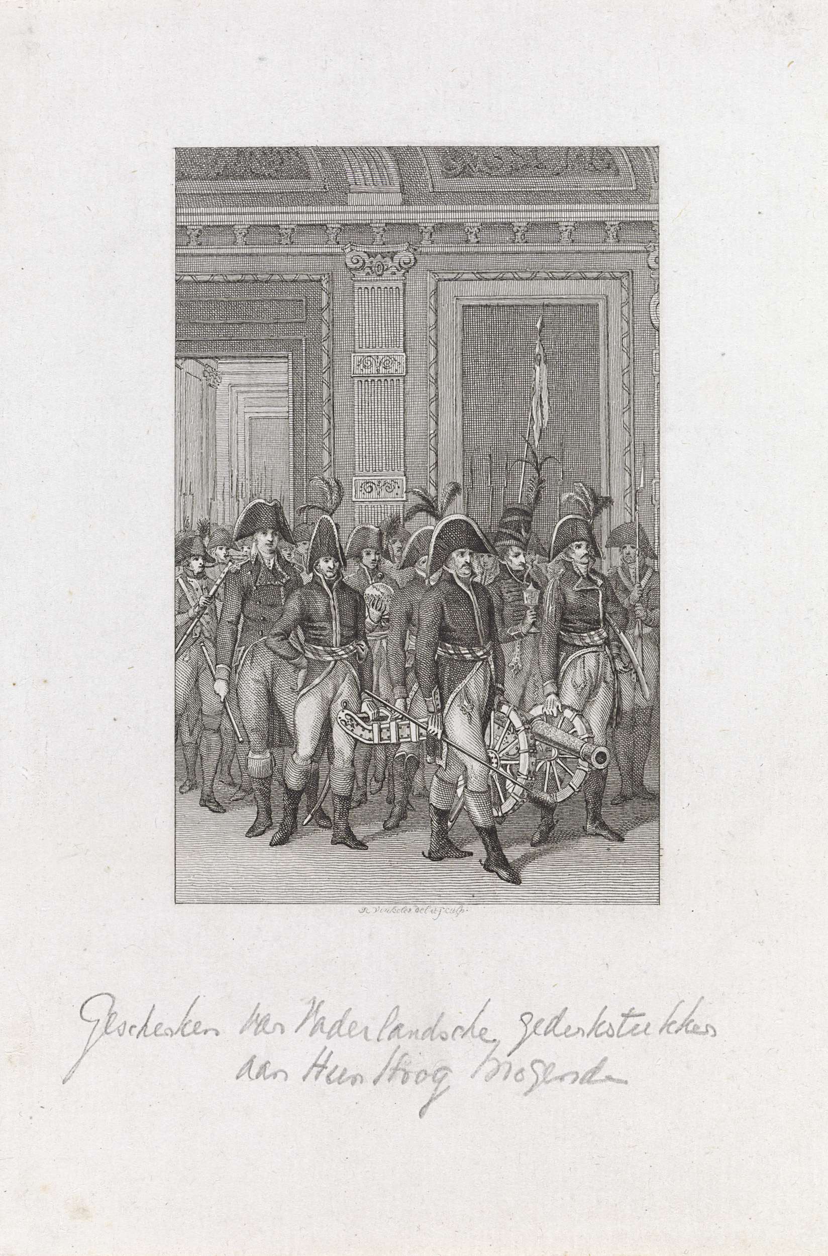 Ceremonie met de teruggave door de Fransen onder leiding van generaal J.B. Dumonceau van vijf belangrijke historische stukken uit de geconfisqueerde stadhouderlijke collectie van Willem V. Franse militairen dragen de stukken het Binnenhof in ter overdracht aan de Staten-Generaal, 12 maart 1795.