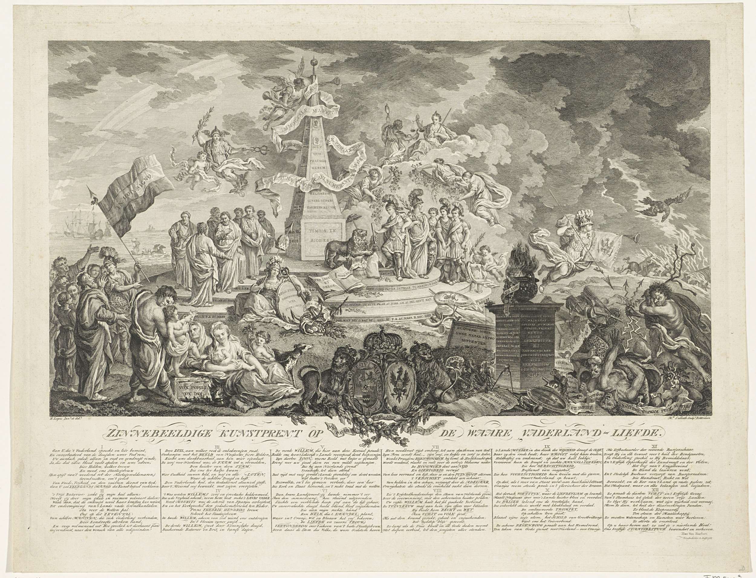 Uitgebreide allegorie ter gelegenheid van het herstel van stadhouder Willem V in 1788. Bij een obelisk ontvangt de prins (in Romeins kostuum) van de Nederlandse leeuw de commandostaf, rechts zijn echtgenote en kinderen, eveneens in klassiek gewaad. Centraal voor het monument zit de Nederlandse Maagd. In de wolken Mercurius, Voorzichtigheid, Faam en Gerechtigheid. Links op ...