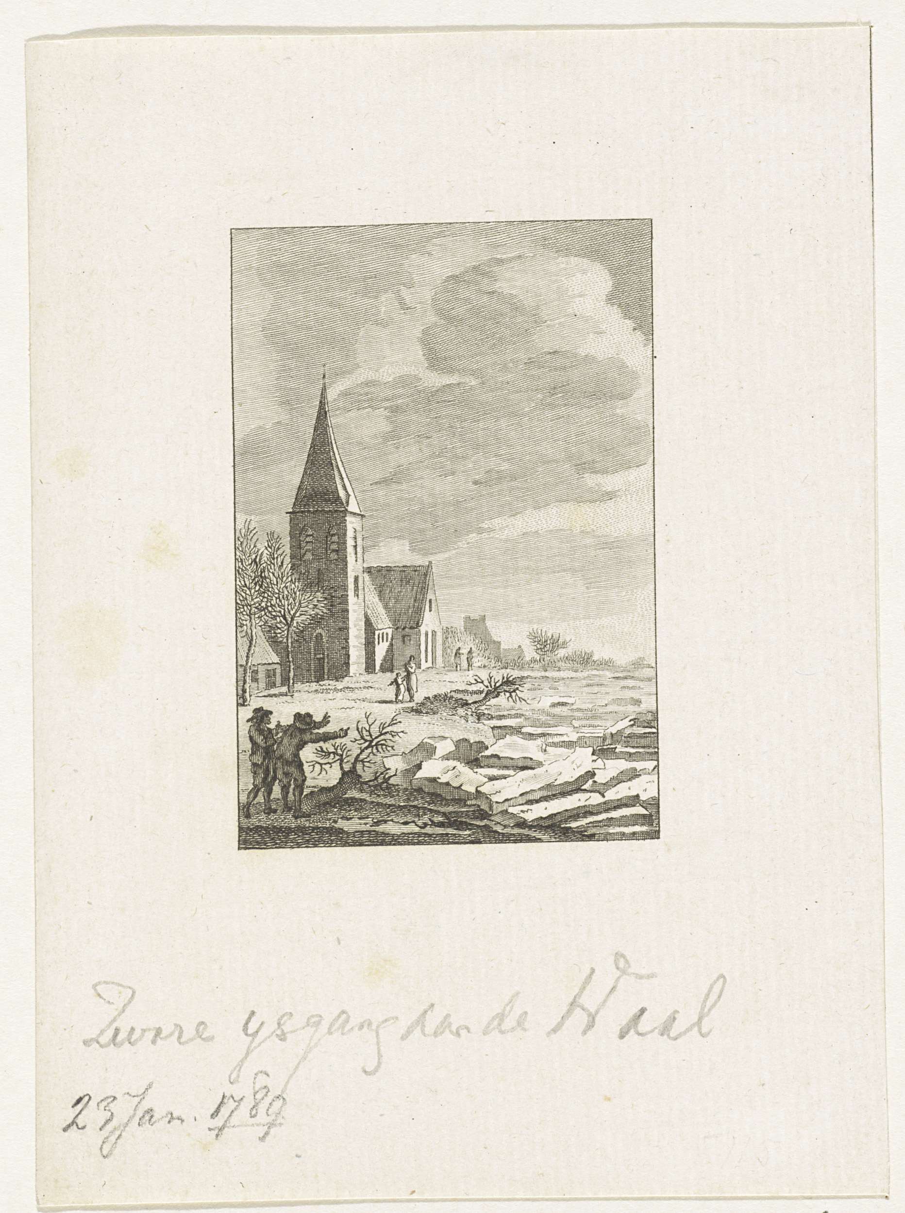 Een berg van kruiend ijs in de dijk bij de Waal, 23 januari 1789. Met enkele toeschouwers.