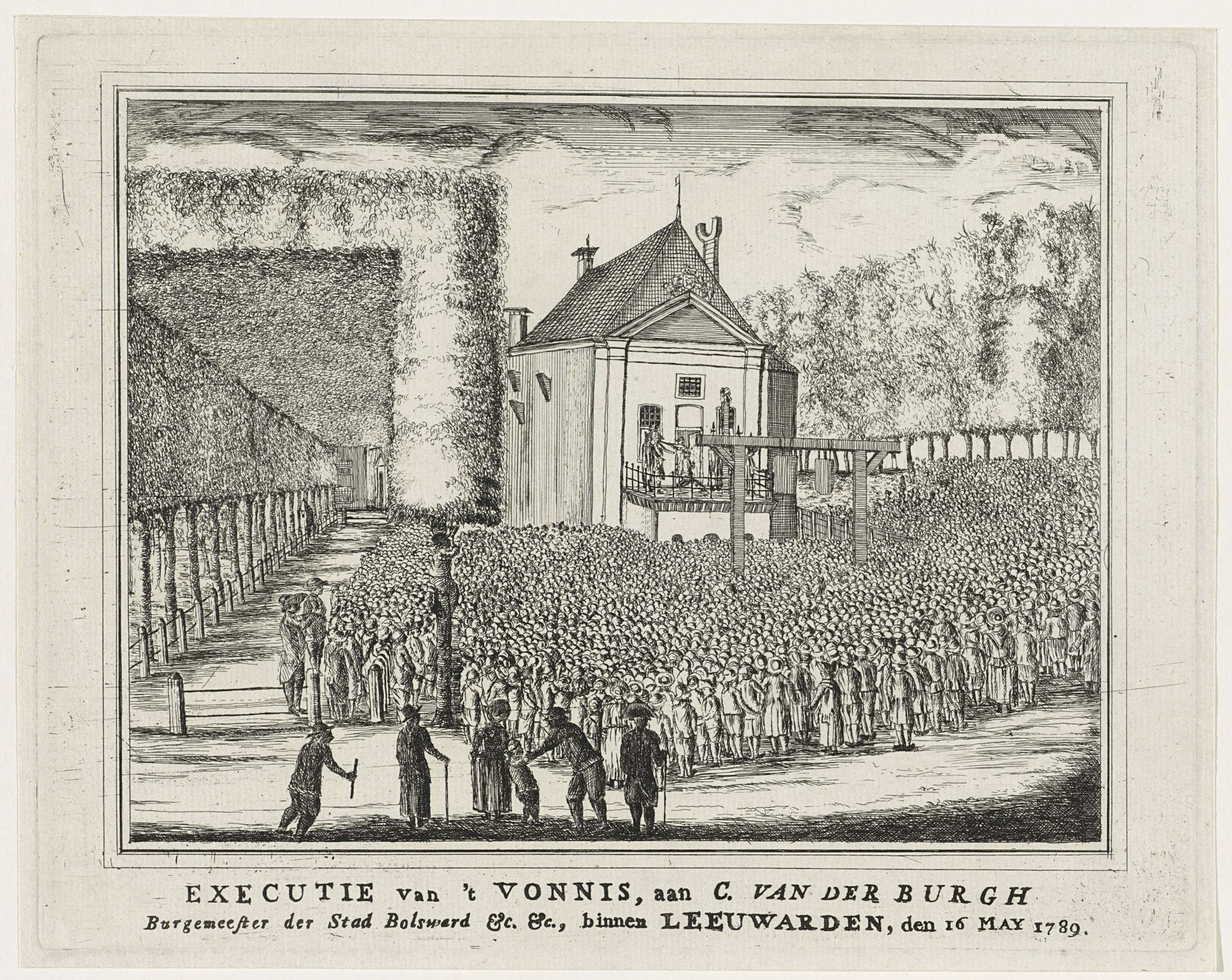 Terechtstelling van Cornelis van der Burg, uitgesproken patriotse burgemeester van Bolsward, te Leeuwarden op 16 mei 1789. Voor het schavot een grote massa toeschouwers. Als de burgemeester geblinddoekt knielt op het schavot houdt de beul het zwaard boven zijn hoofd en wordt het doodsvonnis omgezet in een verbanning van twintig jaar.