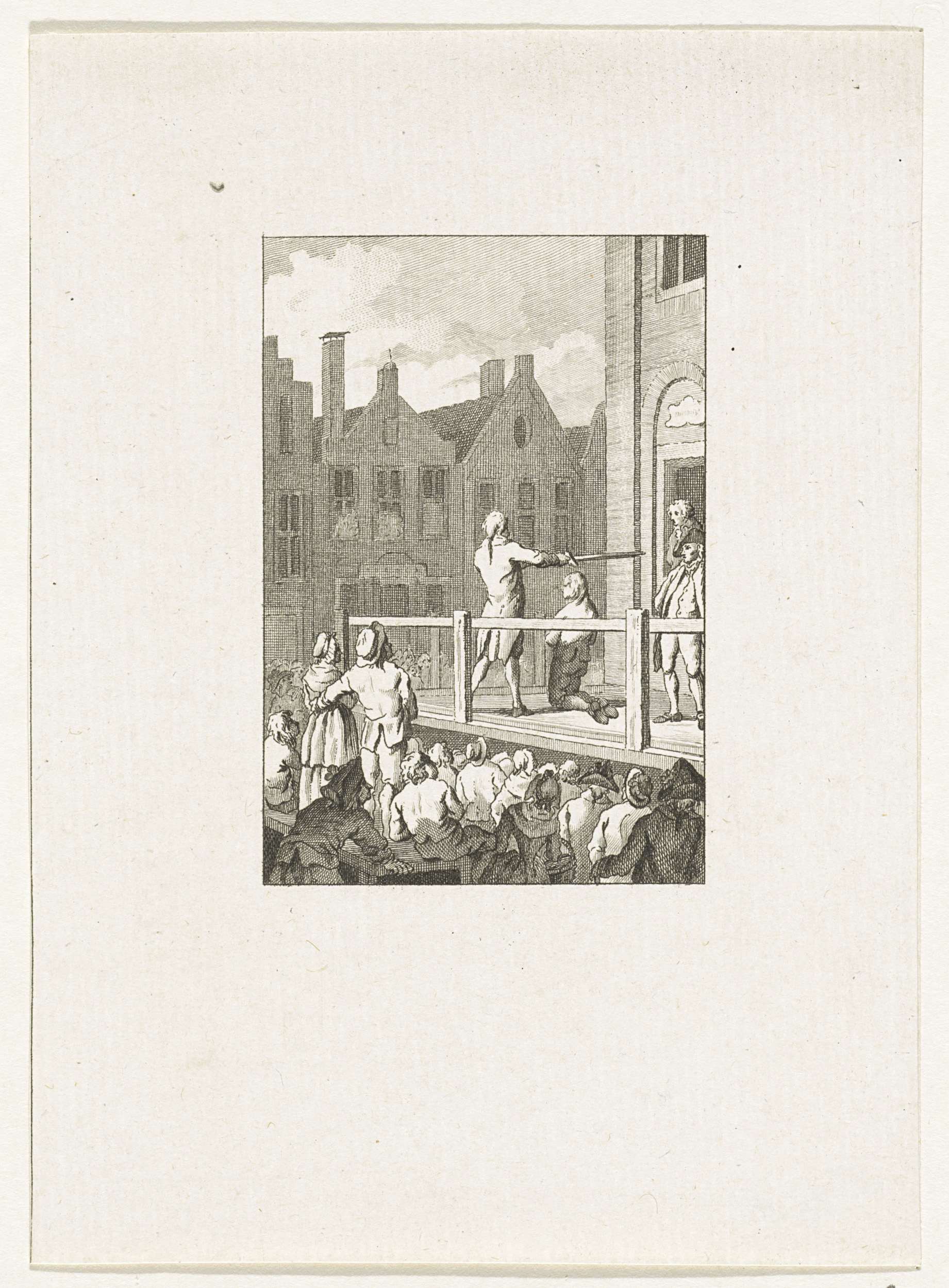 Terechtstelling van Cornelis van der Burg, uitgesproken patriotse burgemeester van Bolsward, te Leeuwarden op 16 mei 1789. Als de burgemeester geblinddoekt knielt op het schavot houdt de beul het zwaard boven zijn hoofd en wordt het doodsvonnis omgezet in een verbanning van twintig jaar.
