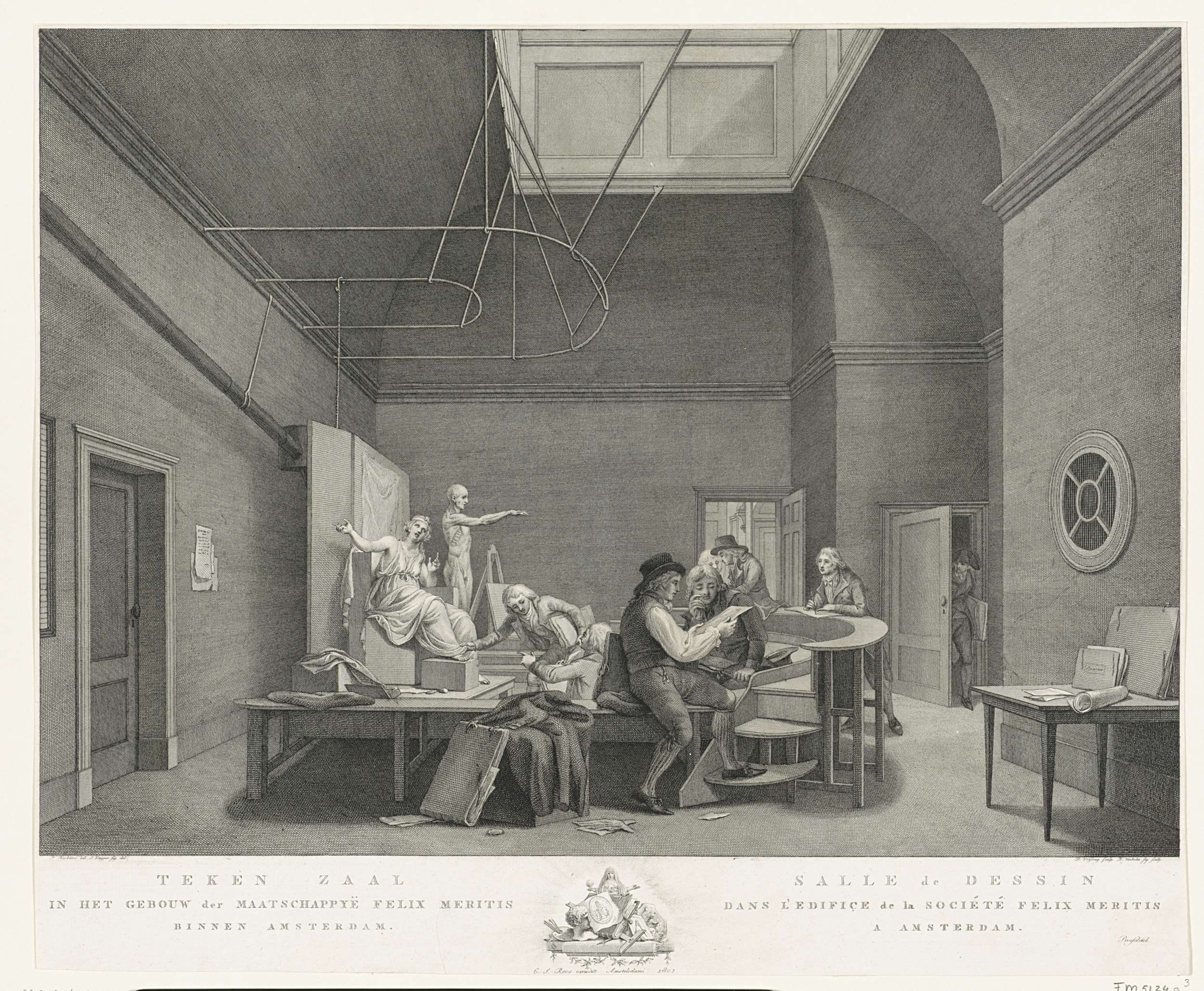 Tekenles in de Tekenzaal in het gebouw van de maatschappij Felix Meritis te Amsterdam, ingewijd in 1789. Kunstenaars tekenen naar gipsmodel.
