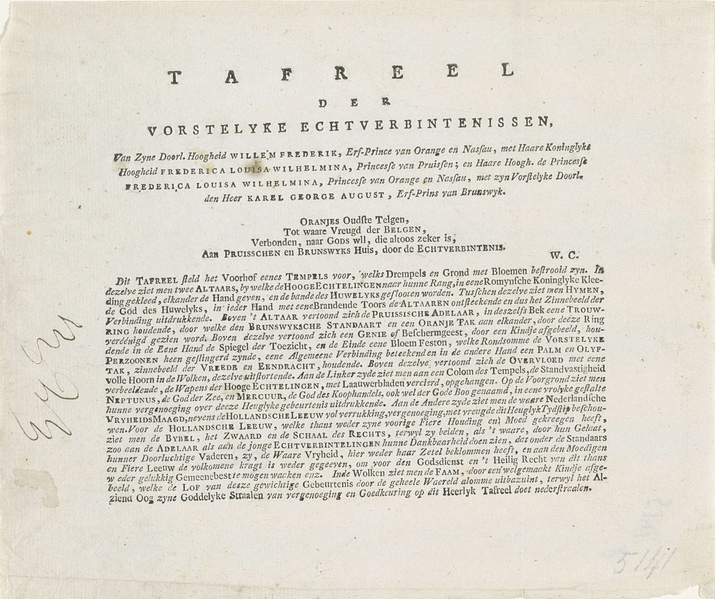 Tekstblad met een verklaring van de allegorische voorstelling ter ere van de huwelijken van prinses Louise van Oranje-Nassau met Karel van Brunswijk-Wolfenbüttel te Den Haag op 14 oktober 1790 en van prins Willem Frederik (de latere koning Willem I) met Wilhelmina Frederica van Pruisen op 1 oktober 1791.