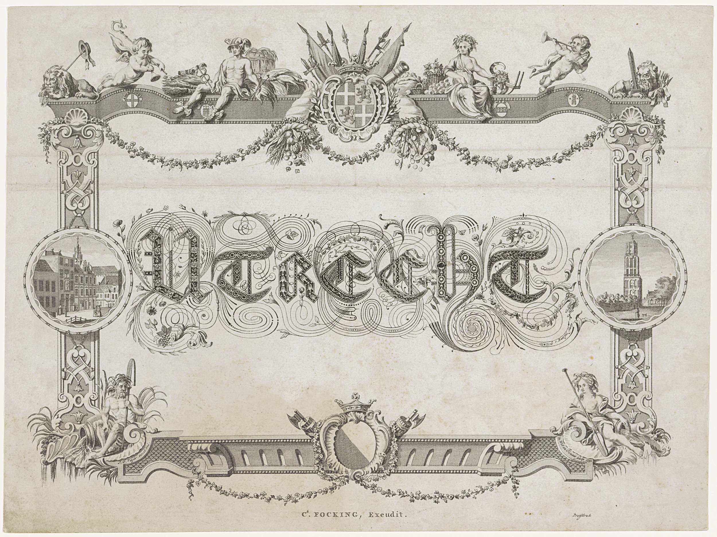 Kalligrafie van de naam van de provincie Utrecht. Binnen een kader met het provinciewapen, allegorische en mythologische figuren, wapens van de belangrijkste steden en twee topografische gezichten. Hier: Stadhuis en Domtoren te Utrecht. Onderdeel van een serie van zeven kalligrafieën van de provincies. Op de achterzijde zijn met potlood de contouren om enkele handen getrokken.
