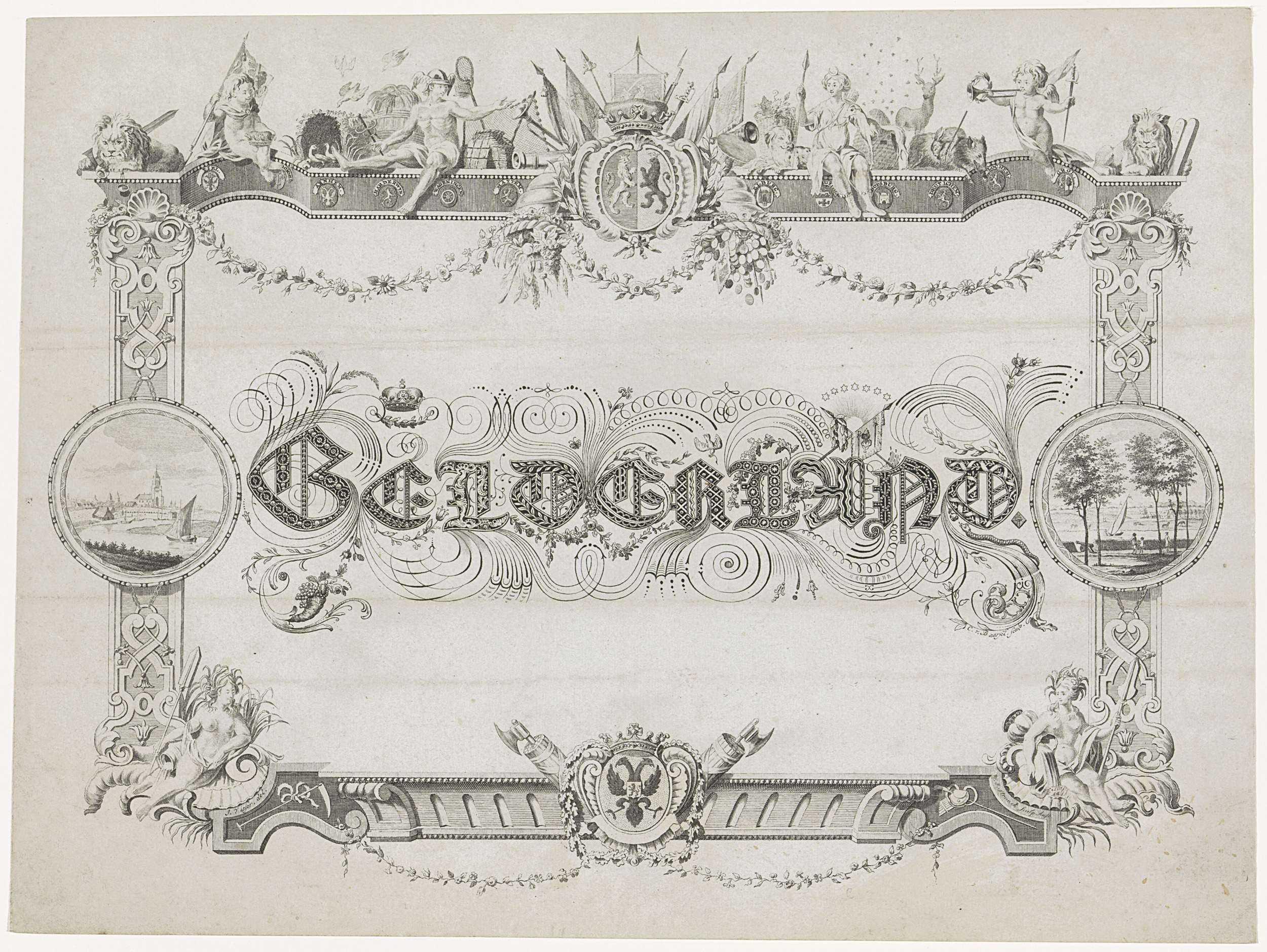 Kalligrafie van de naam van de provincie Gelderland. Binnen een kader met het provinciewapen, allegorische en mythologische figuren, wapens van de belangrijkste steden en twee topografische gezichten. Hier: gezichten op Arnhem en Zutphen. Onderdeel van een serie van zeven kalligrafieën van de provincies.