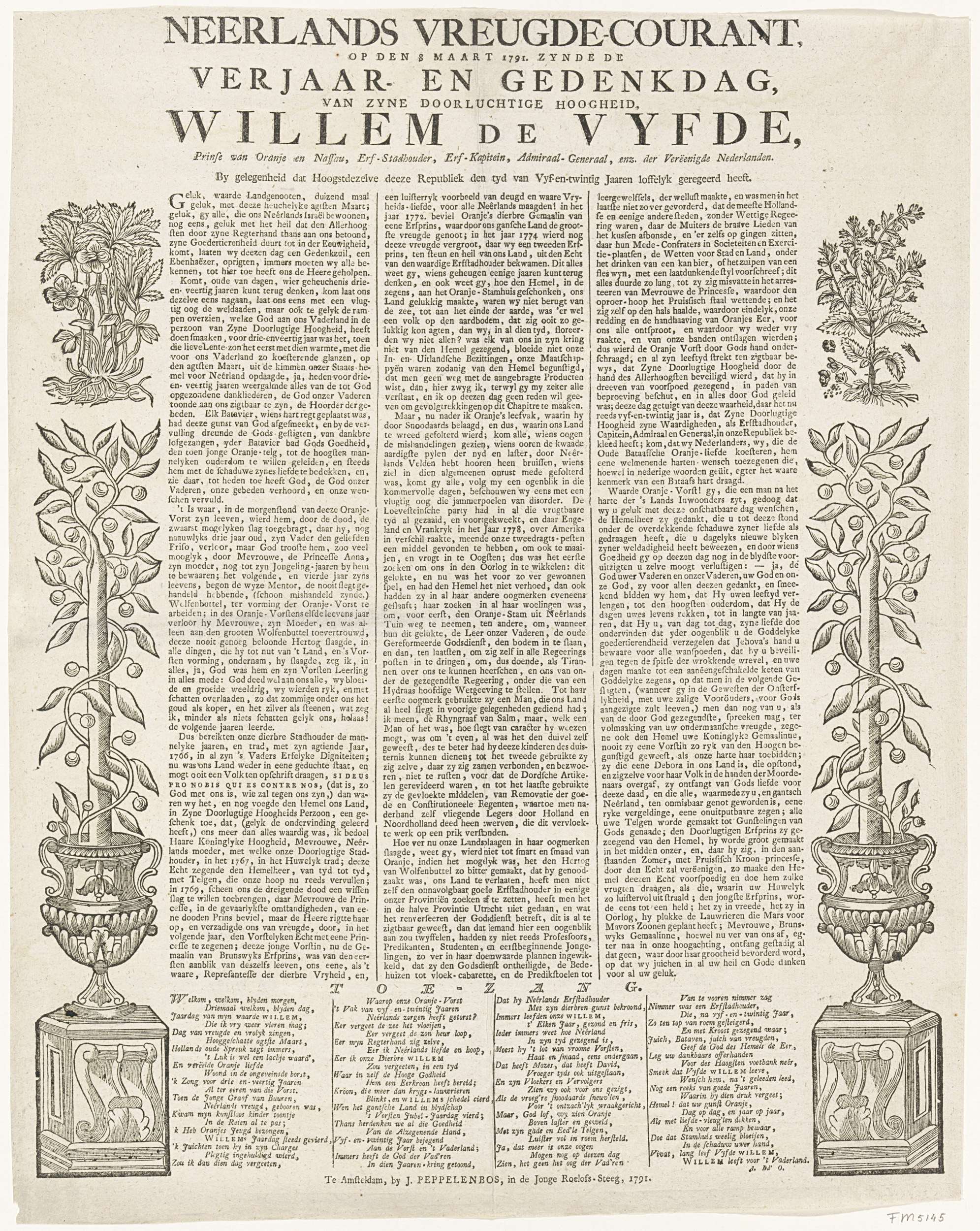 Vreugdecourant verschenen ter gelegenheid van het 25-jarig jubileum van de regering van stadhouder Willem V, op 8 maart 1791. Blad met tekst in drie kolommen, aan weerszijden potten met oranjebomen en enkele ander planten.