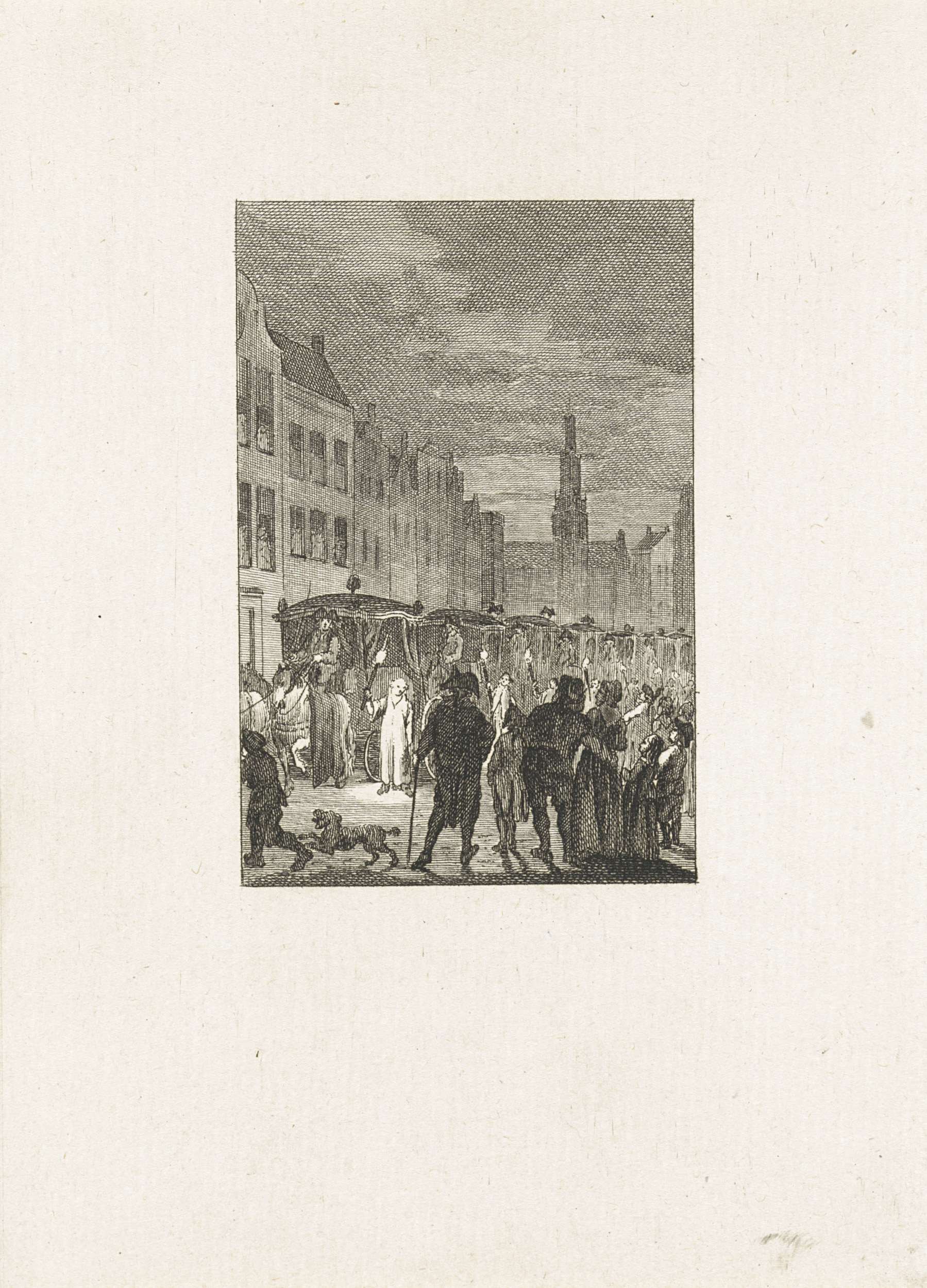 Begrafenis van de Franse marquis de Maillebois te Maastricht, 17 december 1791. Begrafenisoptocht met stoet van rijtuigen begeleid door pages te voet met fakkels.