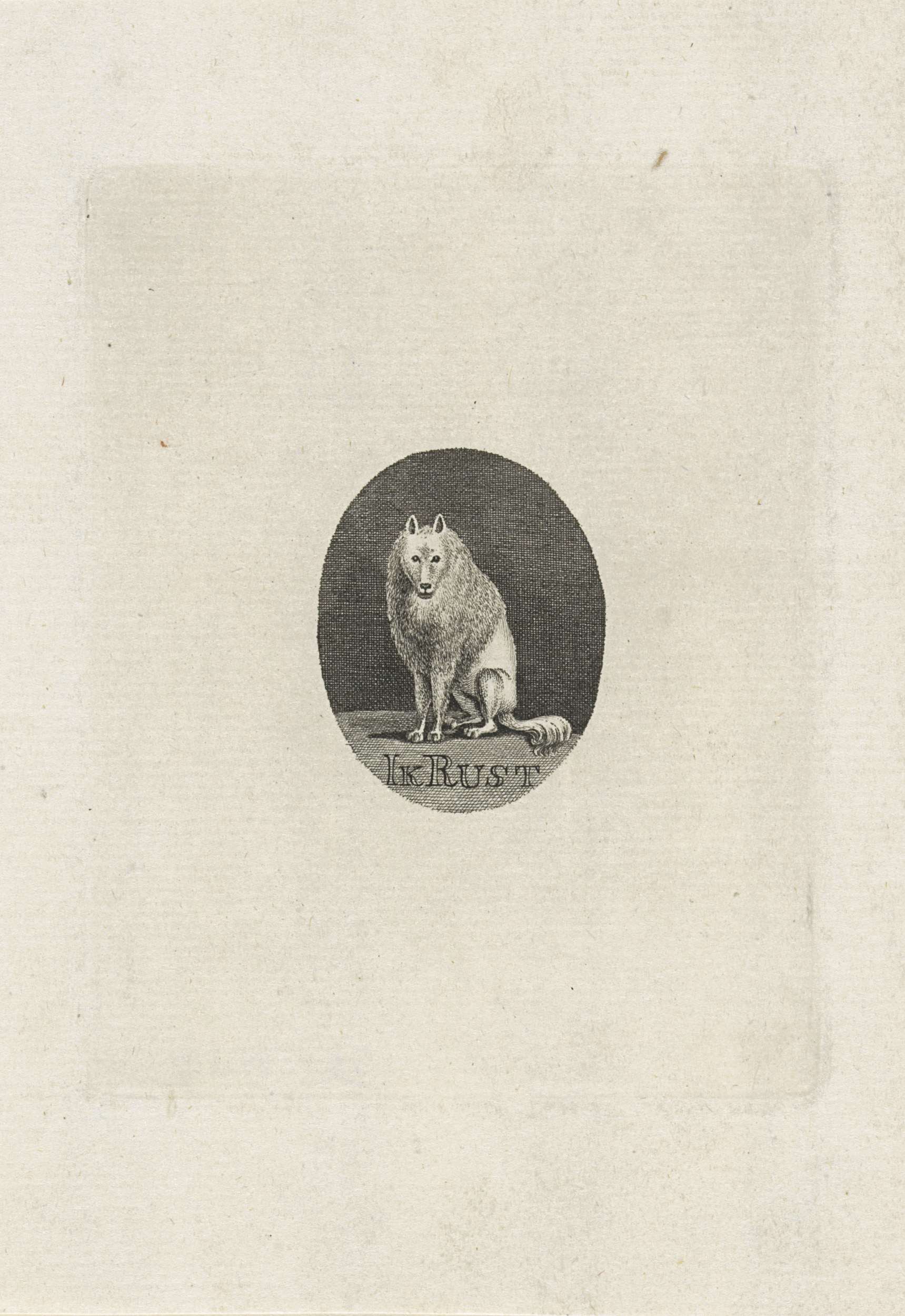 Ovale voorstelling (bestemd voor een medaillon?) met een zittende keeshond, symbool van de patriotten, ca. 1787-1792. Met opschrift: Ik Rust.