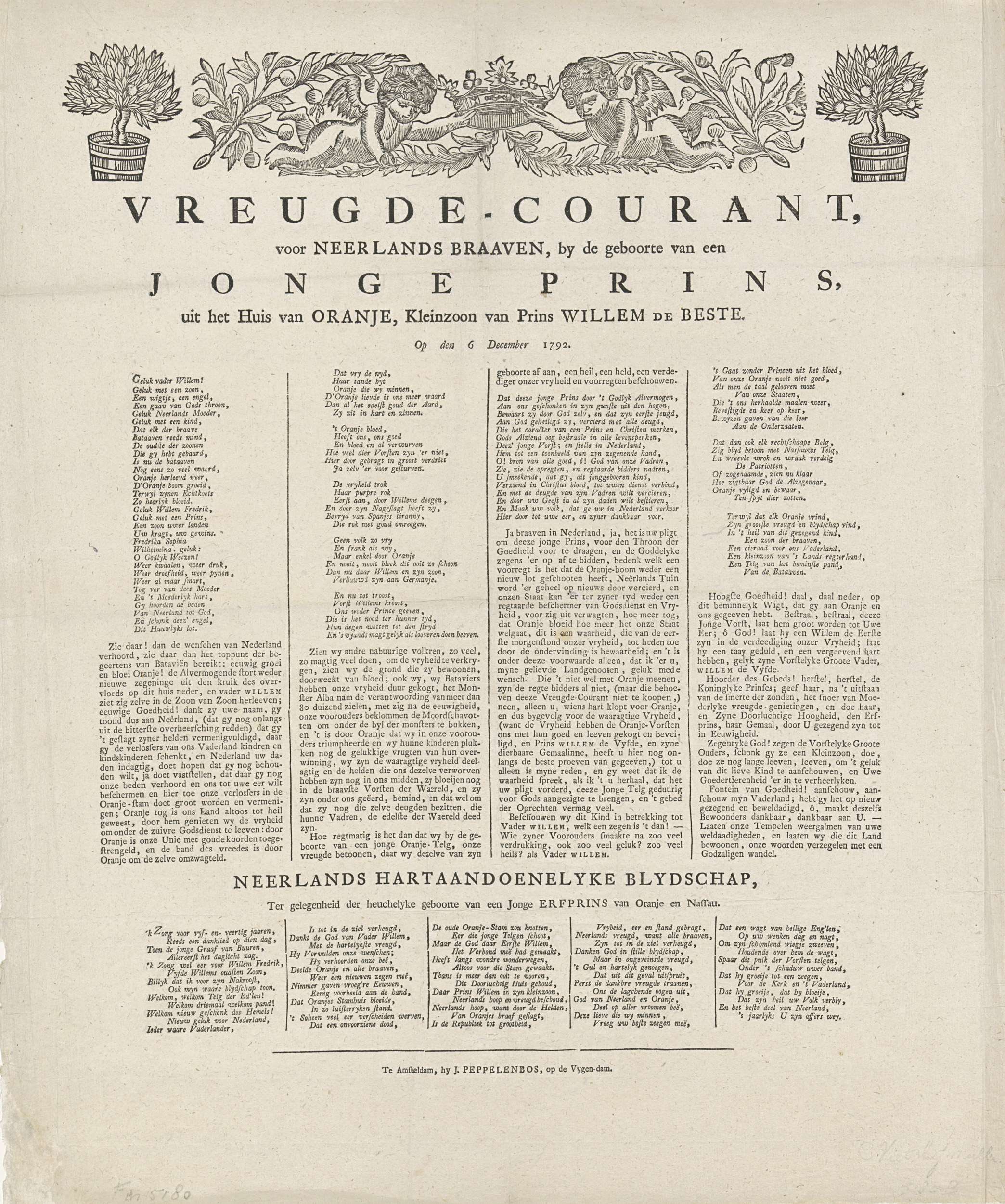Vreugdecourant bij de geboorte op 6 december 1792 van prins Willem Frederik George, de latere koning Willem II. Tekst in vier kolommen met enkele verzen. Bovenaan engelen met een kroon, tussen potten met Oranjebomen.
