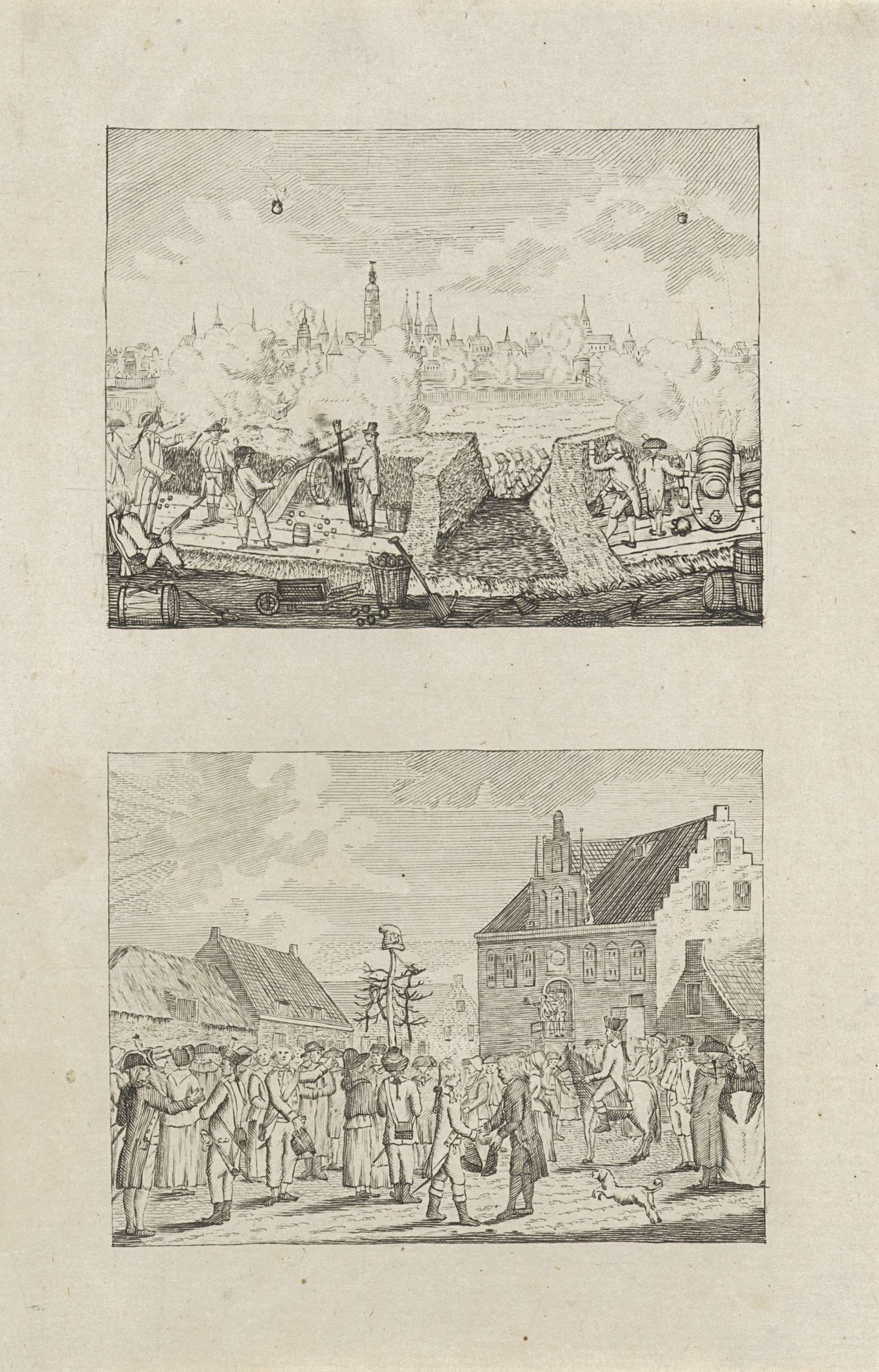 Blad met twee voorstellingen. Boven het beleg van Breda door het Franse leger, februari 1793. Onder de ontvangst van de Fransen voor het stadhuis, 21 februari 1793.