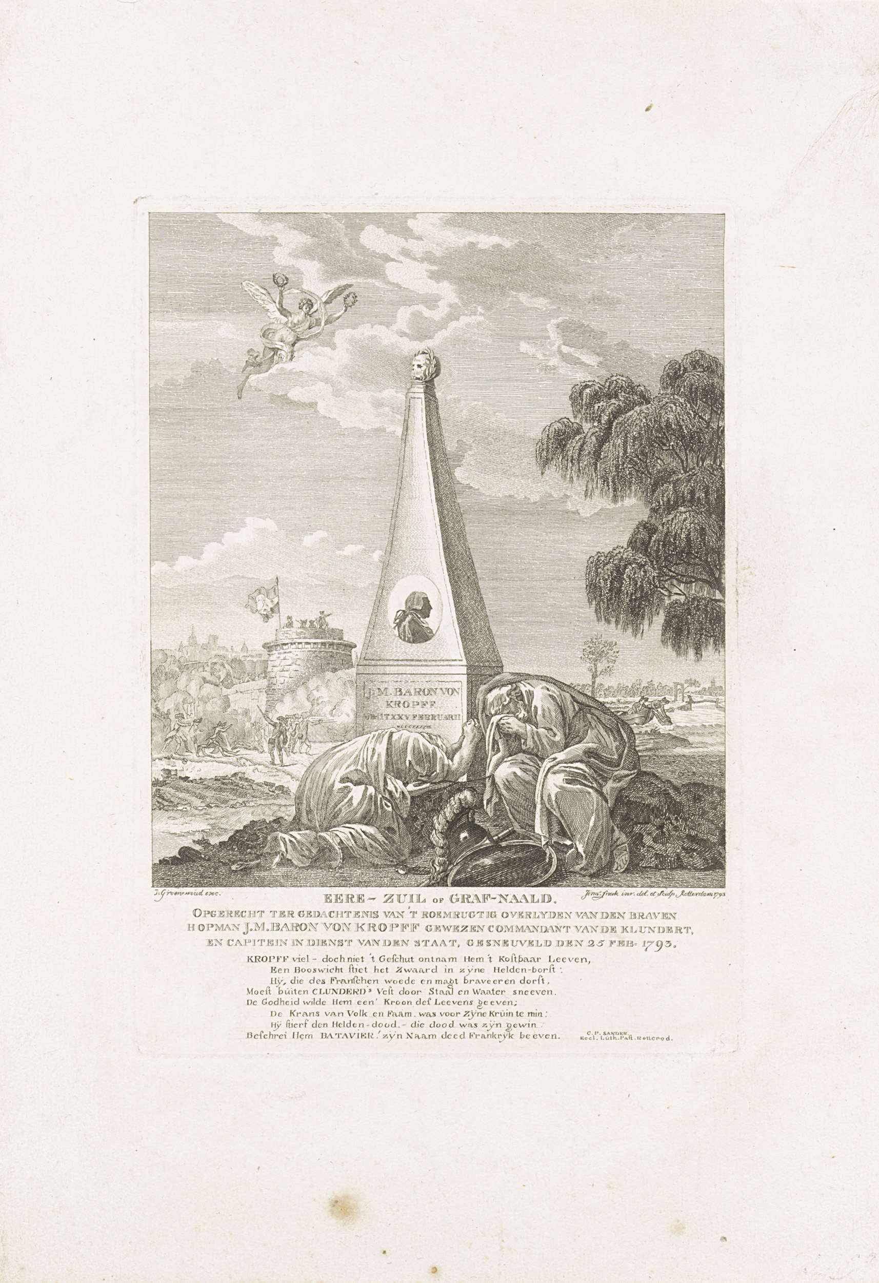 Allegorisch monument voor Joachim Maurits baron van Kropff, gesneuveld bij de verdediging van Klundert tegen het Franse leger, 25 februari 1793. Voor een grafnaald twee voorover gebogen treurende figuren, Constitutie en Vaderlandsliefde. In de lucht de Faam met twee kransen. Op met monument een medaillon met portret. Op de achtergrond de verdediging van de vesting ...