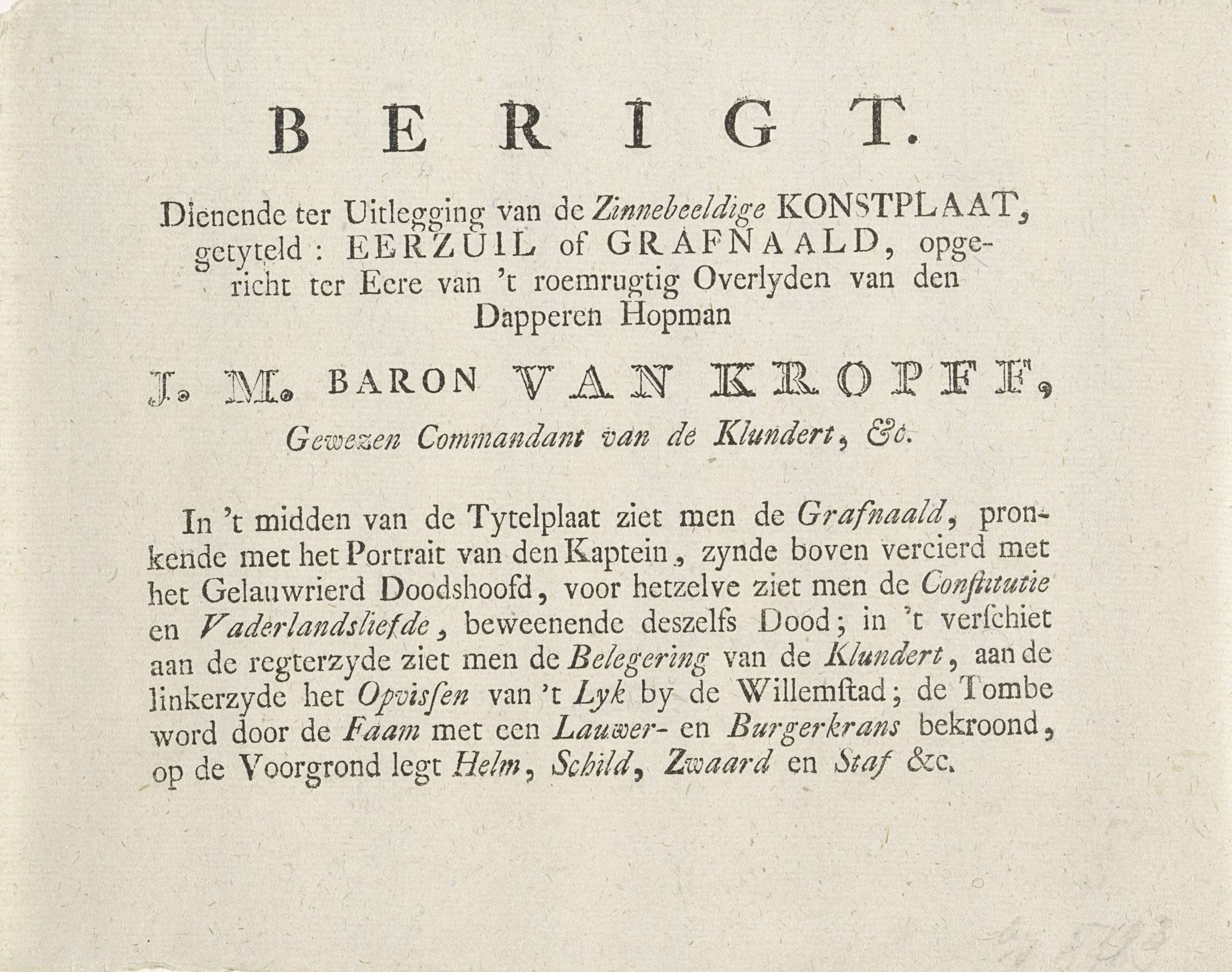 Tekstblad met een korte verklaring van de voorstelling van het allegorische monument voor Joachim Maurits baron van Kropff, gesneuveld bij de verdediging van Klundert tegen het Franse leger, 25 februari 1793.