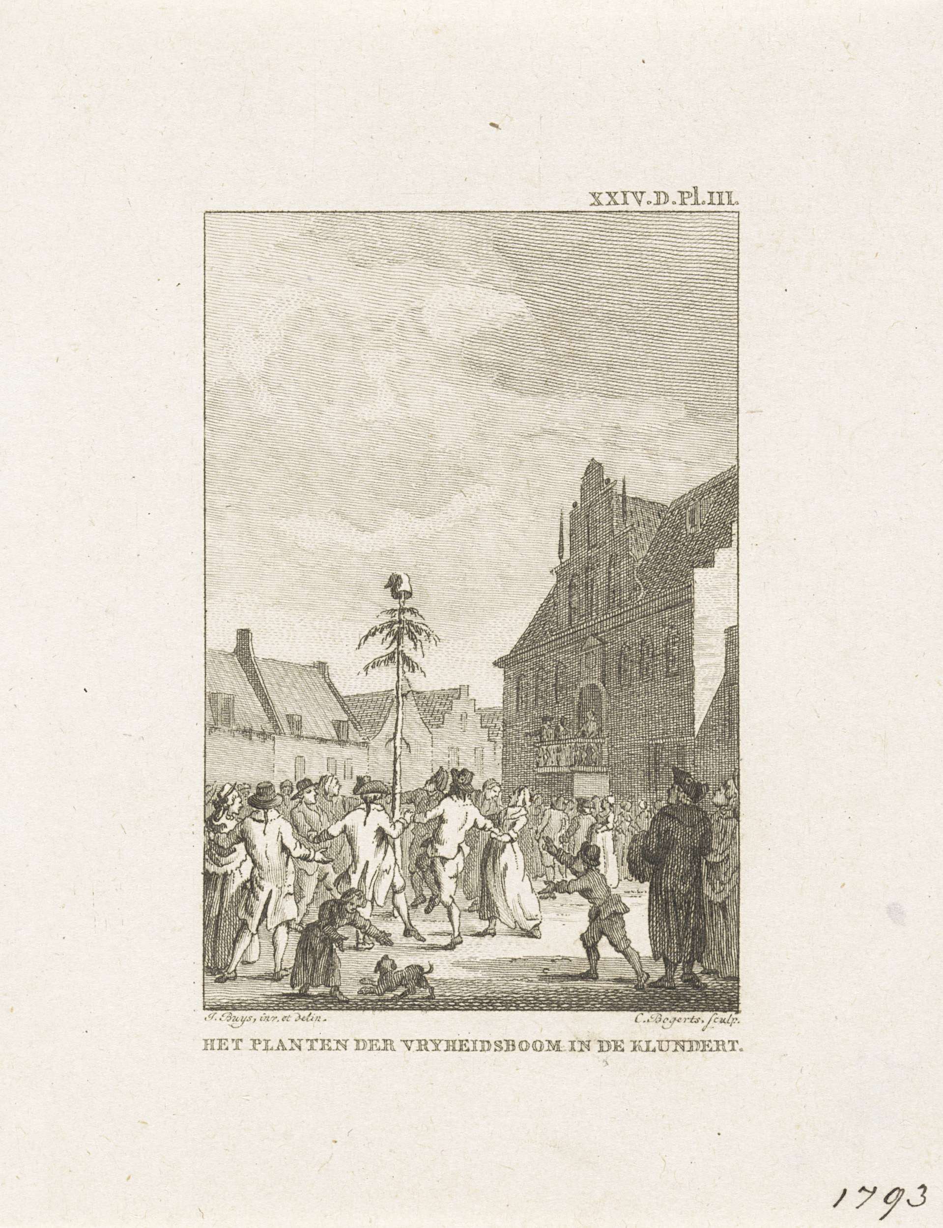 Dansen om de vrijheidsboom opgericht door de Fransen voor het stadhuis te Klundert, 25 februari 1793. Gemerkt rechtsboven: XXIV.D.Pl.III.
